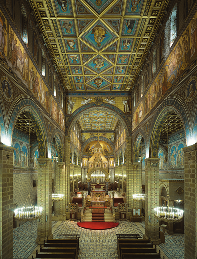 Belépve diadalív által kettéosztott hatalmas belső tér tárul föl, amelynek hatását a sátoros főoltár fokozza. A kóruson négy manuálos, 6101 síppal rendelkező orgona áll, az egykori pécsi Angster Orgonagyár alkotása. A Jézus Szíve és a Corpus Christi kápolnát Lotz Károly falfestményei díszítik. Székely Bertalan világhírű faliképei láthatók a Mária kápolnában és a Szent Mór püspökről elnevezett kápolnában. A 12. századi, nagy alapterületű, keresztboltozatos, öthajós altemplomban régészeti ásatások során megtalálták, majd újratemették Janus Pannonius pécsi püspök és humanista földi maradványait. Tiszteletére ugyanott szobrot állítottak.