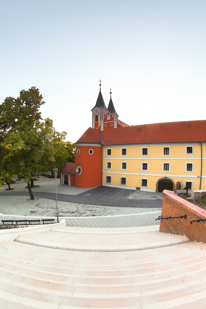 A templom előtti „várfal” a főlépcső két oldalán 1934-ben nyerte el mai formáját. Az alatta kialakított sétányon Assisi Szent Ferenc szobra áll. A sétány a pavilonsor udvarába torkollik, ahol februártól majd a Laudate kegytárgybolt működik és február végén a Bistrosa kávézó is megnyitja kapuit.