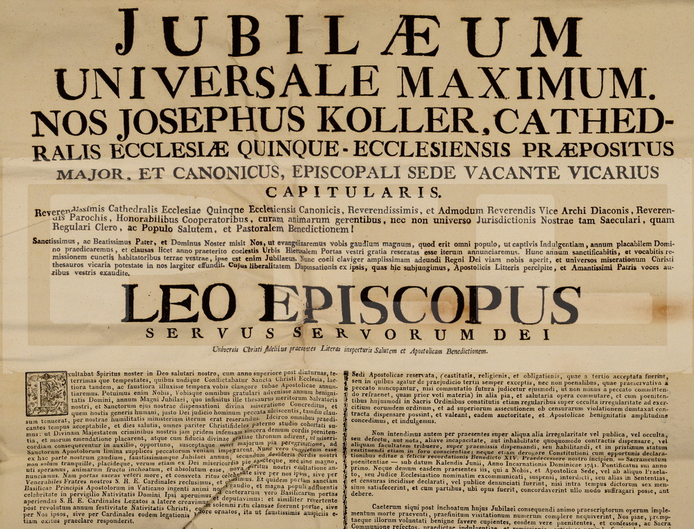 A pápák által meghirdetett szentévek az üdvtörténet különleges kapcsolódási pontjait jelentik égiek és földiek között, a kegyelmek kimeríthetetlen forrásai mindenki számára, mely időszakok központi fogalmai a bűnbánat, a bűnbocsánat, a jubileumi búcsú elnyerése - olvasható a levéltári szemelvény egyikében.