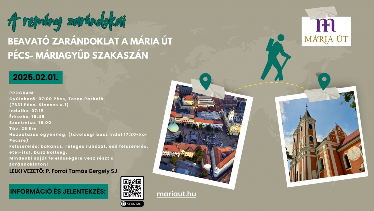 A remény szentéve jegyében február 1-én, szombaton egynapos zarándoklatot szervez a Mária Út és a Mária Rádió közössége Pécs és Máriagyűd között, ahova a kezdő zarándokokat is nagy szeretettel hívják.