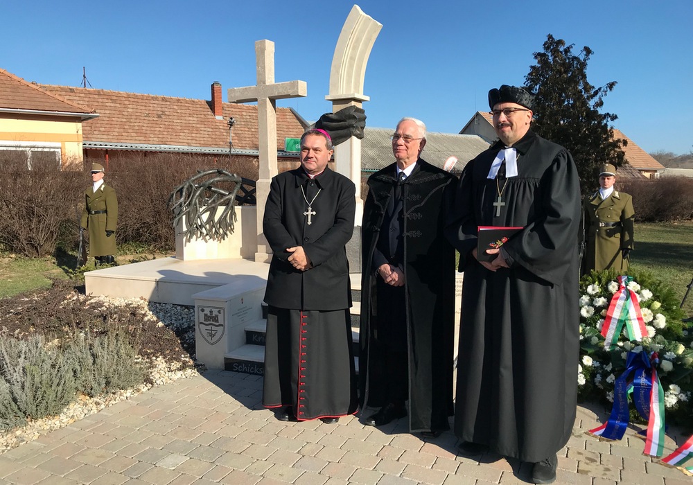 A templomból az egybegyűltek átvonultak a Szatmári Juhos László szobrászművész tervei alapján készült emlékműhöz. Az emlékművet megáldották Kondor Péter evangélikus püspök, Mészáros Zoltán református lelkész és Felföldi László pécsi megyéspüspök. Ezt követően került sor az emlékezés koszorúinak elhelyezésére. Az ünnepségen részt vett és koszorúzott Johannes Haindl, a Német Szövetségi Köztársaság budapesti nagykövete is.