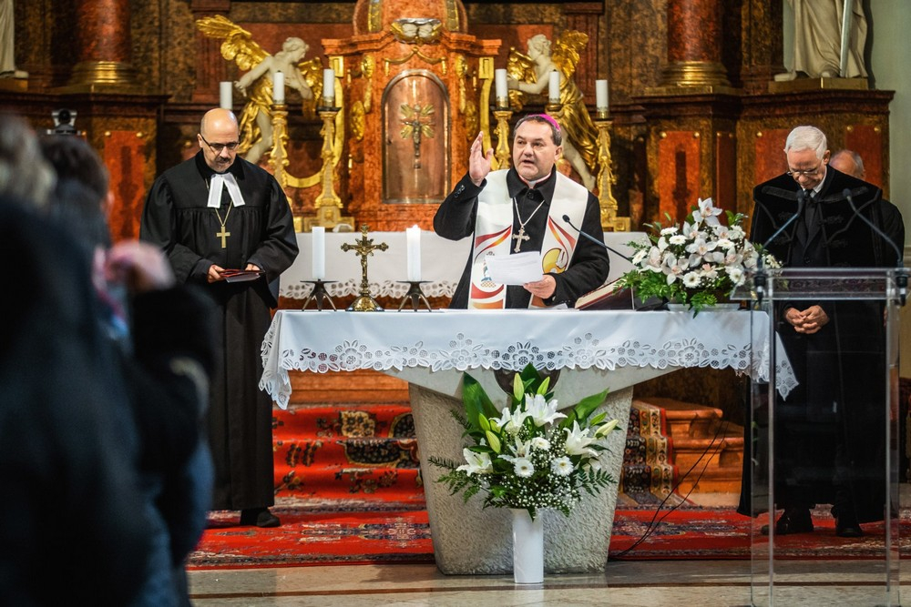 "A múlt tragédiája a jelen ereje" - hangsúlyozta Felföldi László pécsi megyéspüspök az ökumenikus istentisztelet kezdetén köszöntőjében, utalva arra a 200 ezer magyarországi német személy - köztük gyermekek és nők - sorsára, akiket a második világháború után elhurcoltak Németországba, illetve a Szovjetunióba, kitelepítettek Magyarországról a kollektív bűnösség hamis elve alapján. Feladatunk az emberi méltóság megőrzése, ahol ez csorbult, ott újjáépítése. Az ifjúság felé az az üzenete a mai megemlékezésnek, hogy merjenek újat álmodni, újat építeni, mert az Isten ott áll mellettünk minden megpróbáltatásban, ott ahol, éppen vagyunk.