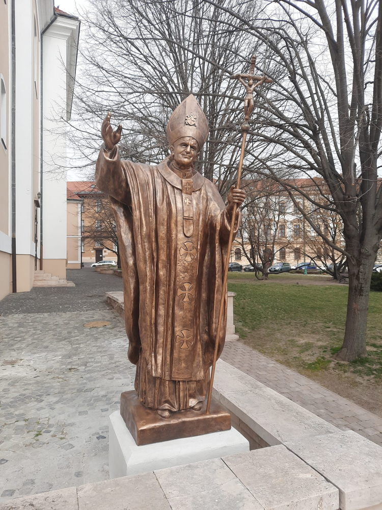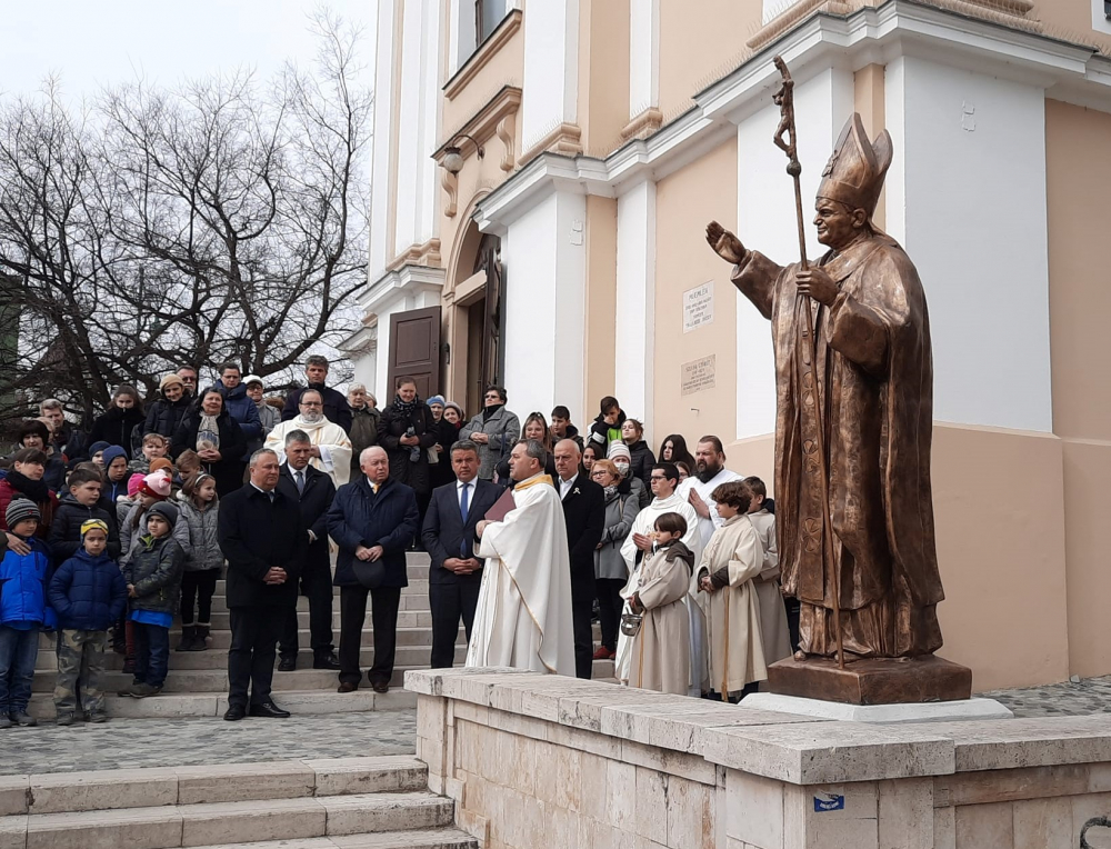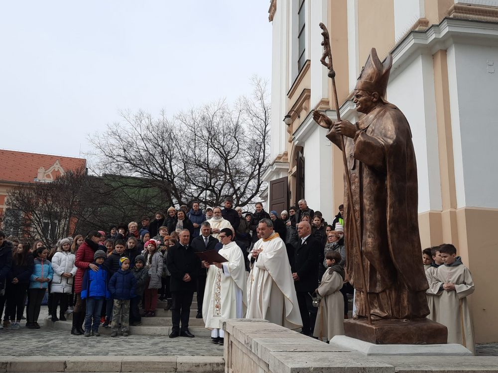 A liturgiát követően Felföldi László megáldotta Szent II. János Pál pápának az Urunk Mennybemenetele templom előtti téren felállított egész alakos szobrát, mely Rózsa László, a Váci Egyházmegye tolnai születésű állandó diakónusa nagylelkű felajánlásának köszönhető. A szobor talapzatára hamarosan tábla kerül, melyre a Ne féljetek! feliratot vésik majd fel. Pápává választása után II. János Pál hívekhez intézett első mondata így hangzott: „Ne féljetek!”. A félelem leküzdésében nagy ereje van az imádságnak, a mély istenkapcsolatnak, mely a pápát is elkísérte kicsiny gyermekkorától egészen a haláláig. "Ne féljetek! Merjetek álmodni! Merjetek elindulni! Ne féljtsétek az életeteket Istentől! A szent pápa egykori gondolatának ma is ez az élő üzenete. Erre gondoljatok, amikor a téren átkelve rápillantotok a szoborra" - fordult a diákokhoz a püspök.