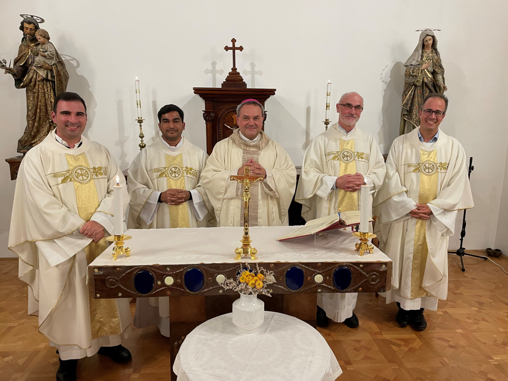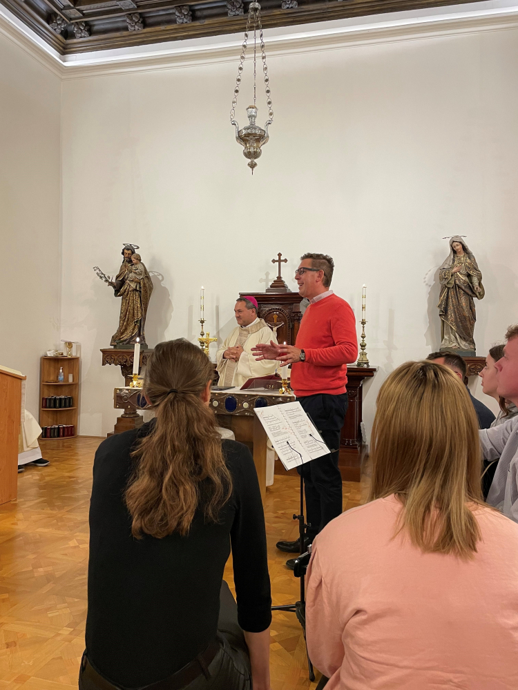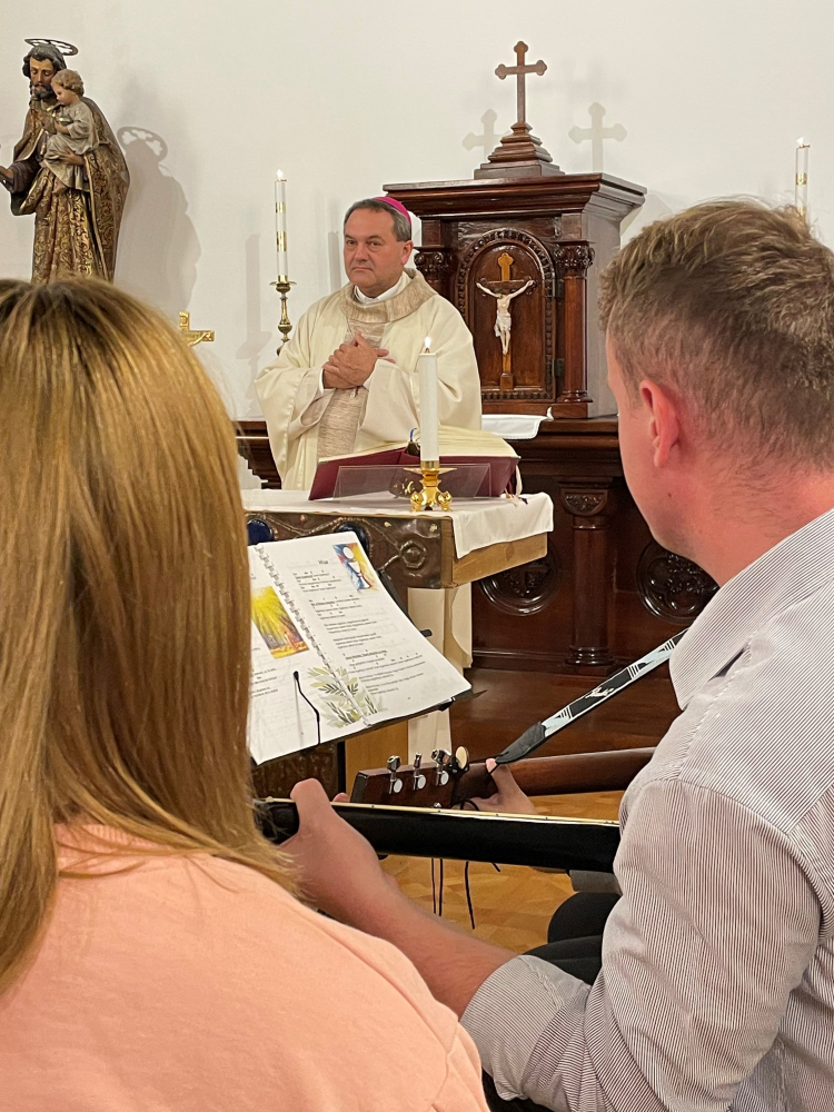 Az előadások után Felföldi László pécsi megyéspüspök celebrálásával szentmisén vett részt a hallgatóság a főiskola kápolnájában. A liturgiát a főpásztorral mutatták be a PPHF meghívására Máltáról, Lengyelországból és Bangladesből Pécsen tartózkodó lelkipásztorok. A háló titkaiba beavató szentbeszéd közvetlen hangvételű elmélkedési részeit Dr. Kovács Gusztáv rektor szinkrontolmácsolásában hallgatták a résztvevők.
