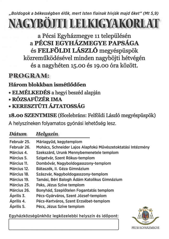 „Boldogok a békességben élők, mert Isten fiainak hívják majd őket” (Mt 5,9) mottóval hívja és várja Felföldi László megyéspüspök és a papság a Pécsi Egyházmegyében élőket egy, a hívek teljes közösségét megszólító nagyböjti rendezvénysorozatra 2023. február 25. és április 5. között.