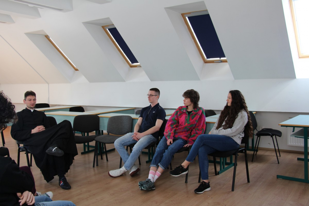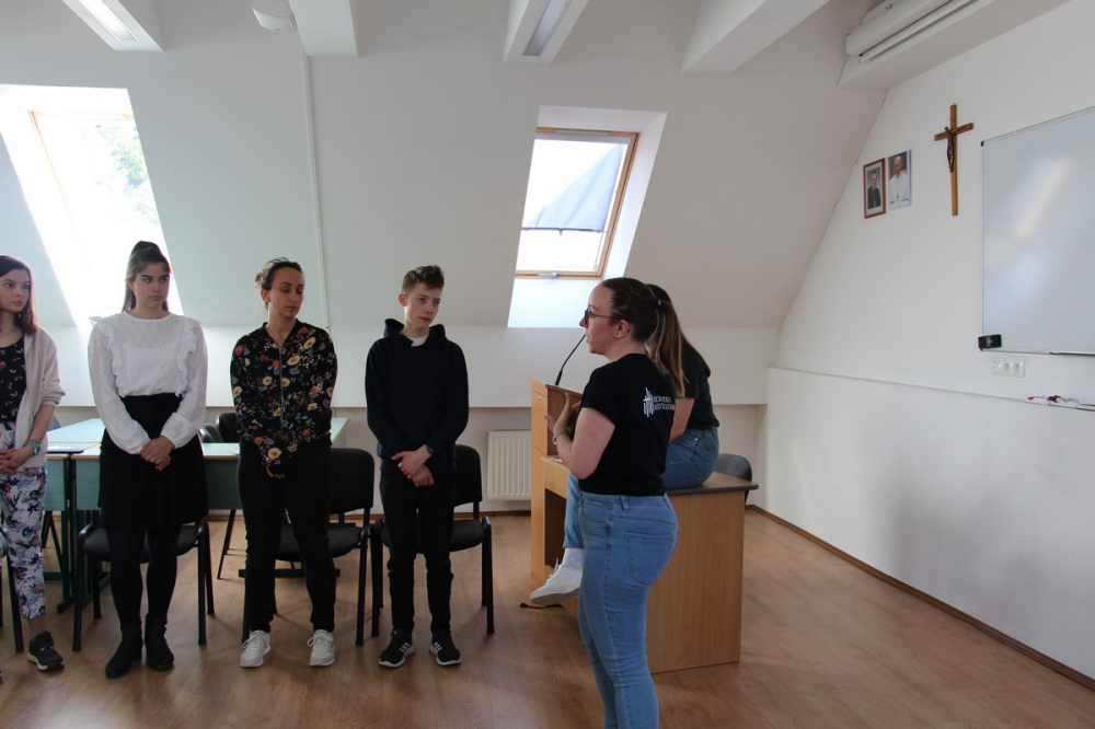 Miután mind az öt csoport teljesítette mindegyik állomást, ismét összegyűltünk az iskola második emeleti aulájában. Itt meghallgattuk az előző héten tartott bibliaismereti vetélkedő győztes előadását, melyet a Pécsi Református Gimnázium két tanulója, Kovács Dóra és Püspöki Panna prezentált nekünk. Ezután a főiskola elsőéves hallgatója, Vajda Rita vezetésével zenés imádság és elcsendesedés következett. Az esemény zárásaként a Pécsi Püspöki Hittudományi Főiskola rektora, prof. dr. Kovács Gusztáv köszönetet mondott a résztvevő középiskolásoknak, valamint a szervezésben közreműködő oktatóknak és hallgatóknak. Kovács József atya, egyetemi lelkész étkezés előtti imája után minden résztvevő testileg is töltődhetett: pizza, valamint - Papp Barbara főiskolai hallgató jóvoltából - bibliai ételek várták a fiatalokat. Az eseményre érkezett pozitív visszajelzések miatt biztosak vagyunk benne, hogy a programok gazdagították a gimnazisták lelki életét.