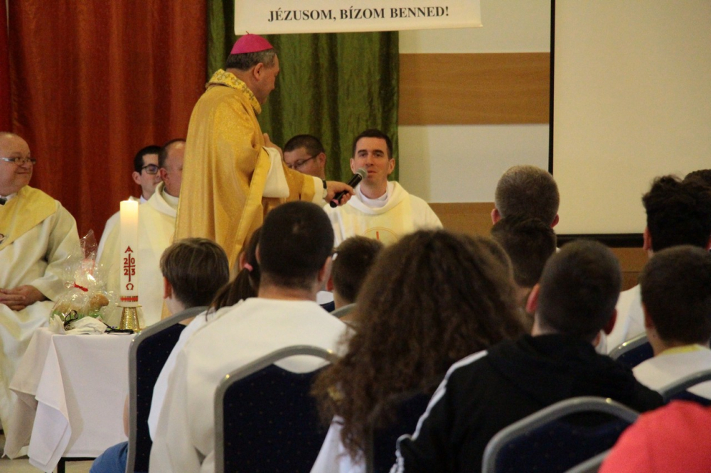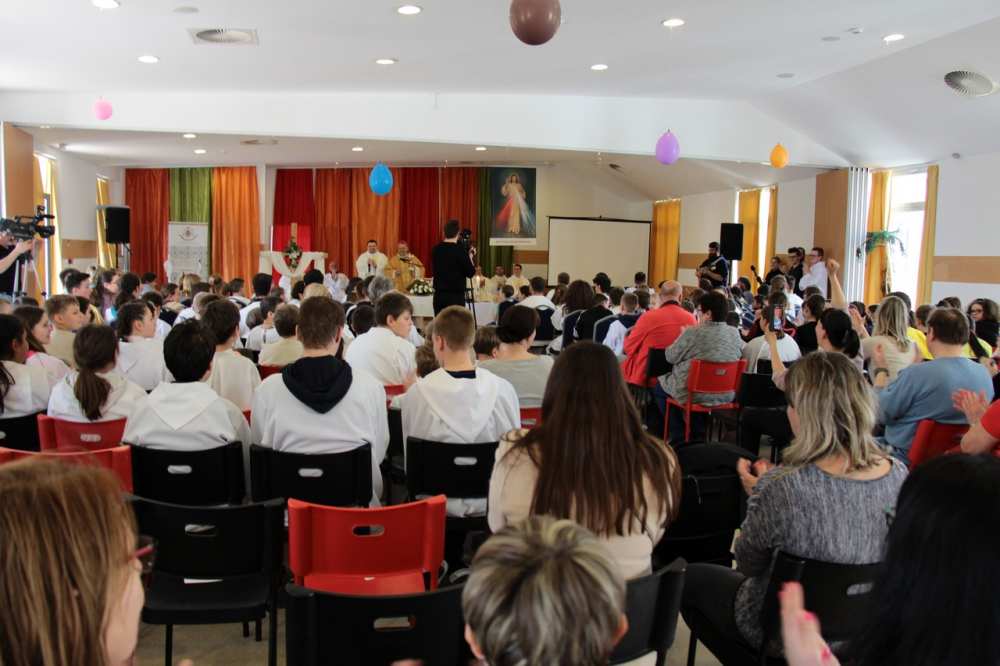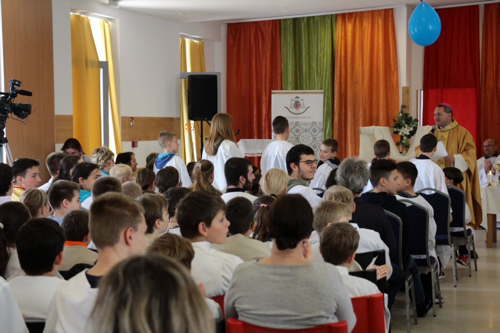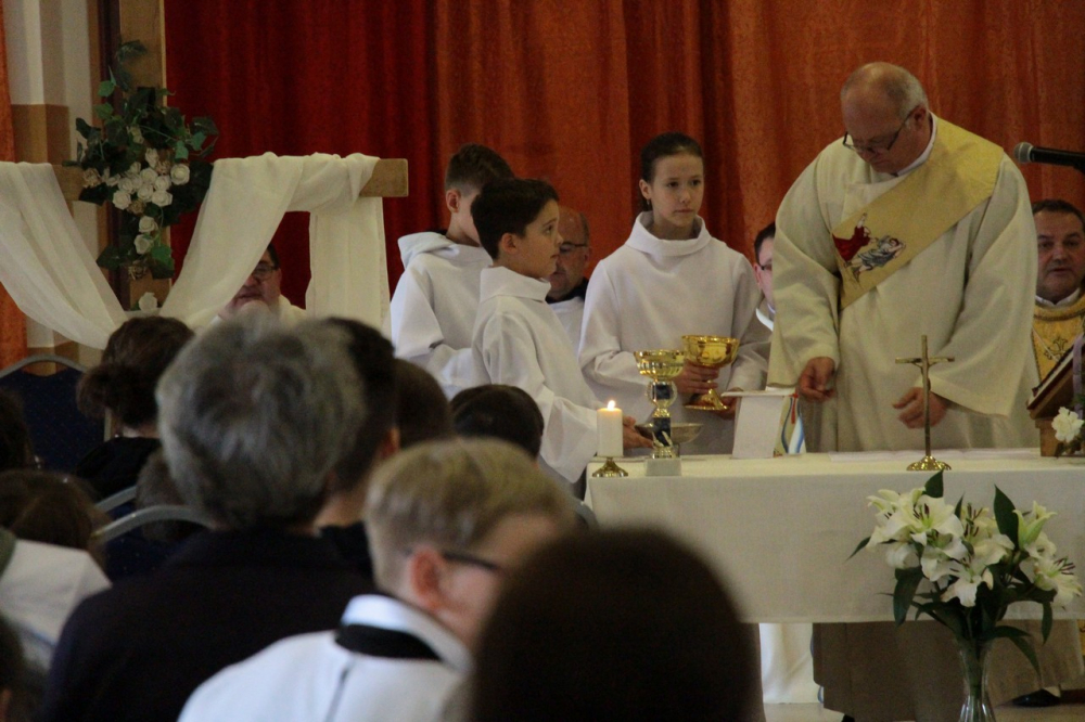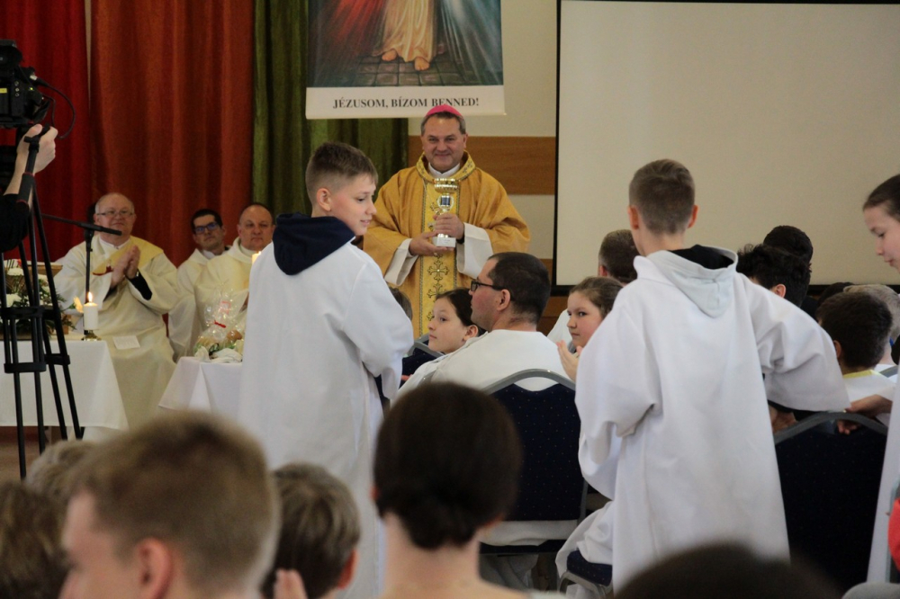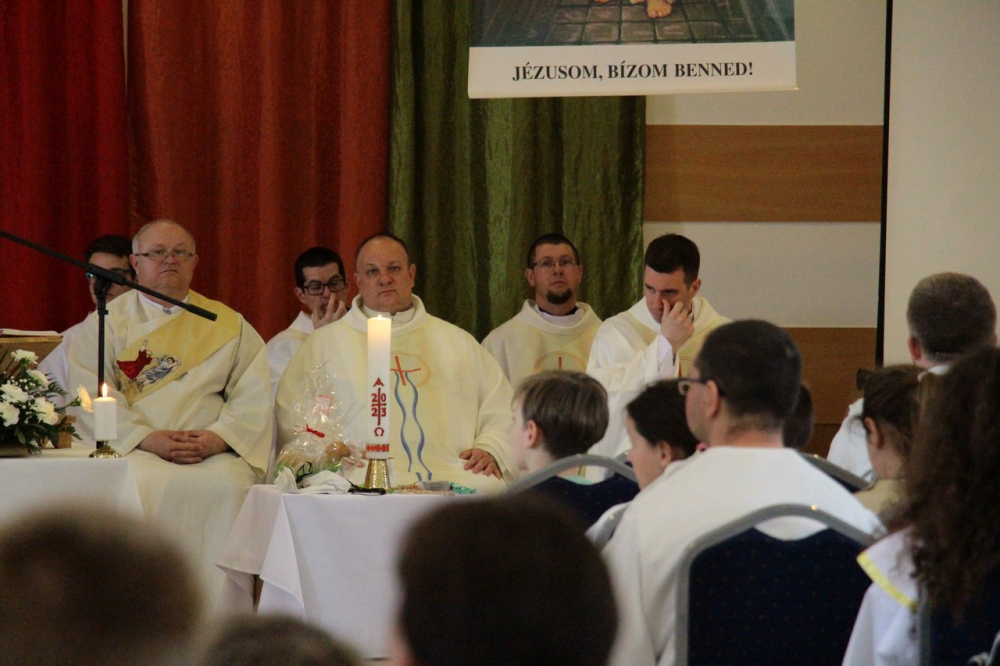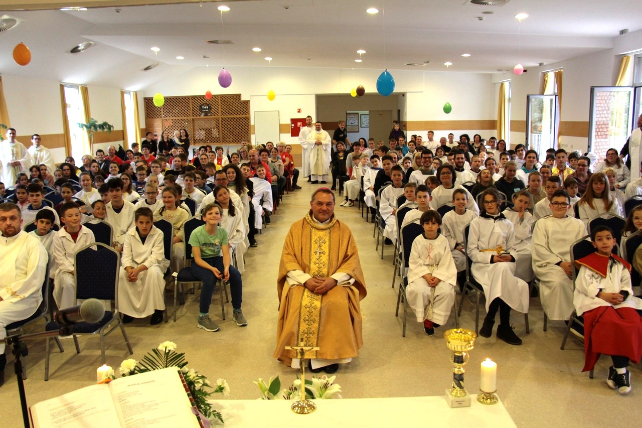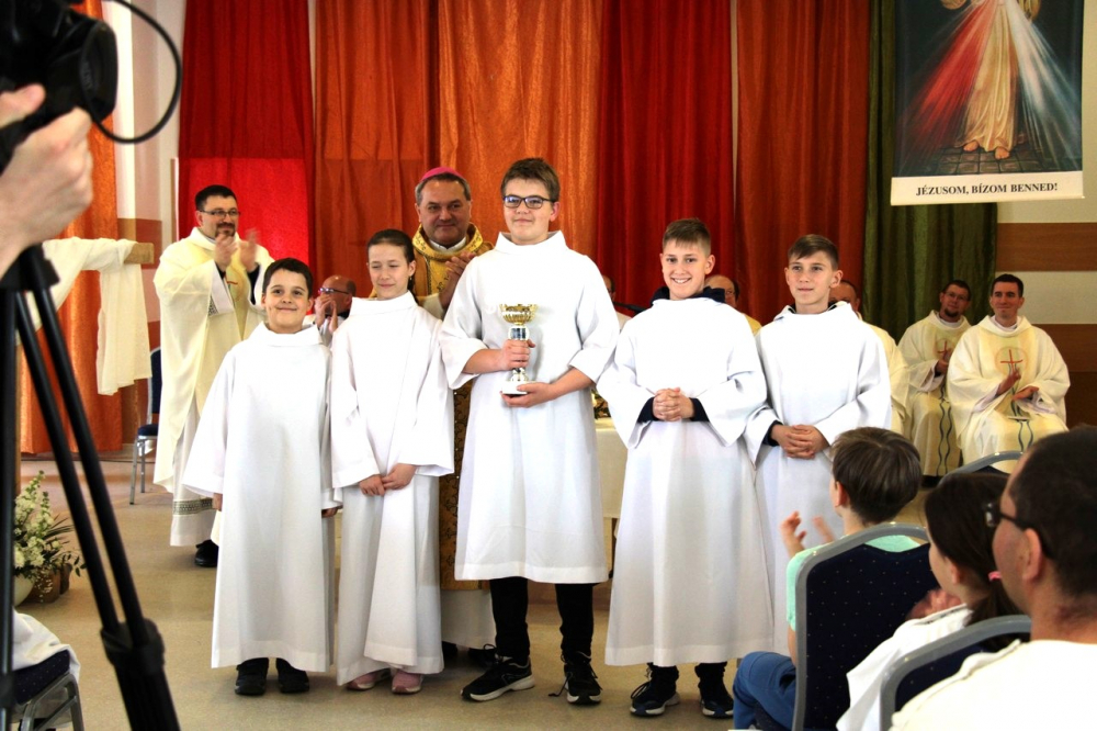 A találozó foglalkozásai 14.30-ig tartottak, amikor a zárómisére való felkészülés következett. A szentmisét Felföldi László megyéspüspök celebrálta, a jelenlevő papok koncelebrálásával. Püspök atya értékes gondolatokkal gazdagította a ministránsokat, például Jézusnak az irántunk való szeretete, hiszen a ministránsnap témájaként az irgalmasság – emellett másnap az Isteni irgalmasság vasárnapját ünnepeltük.