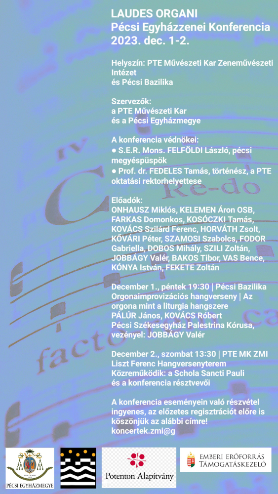 A Pécsi Tudományegyetem (PTE) Művészeti Karának Zeneművészeti Intézete és a Pécsi Egyházmegye közös szervezésében LAUDES ORGANI címmel rendeznek egyházzenei konferenciát, melynek kiemelt programja lesz a december 1-jén, 19.30 órai kezdettel megrendezésre kerülő hangverseny.