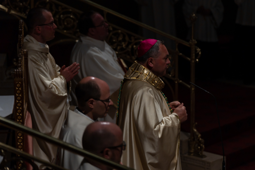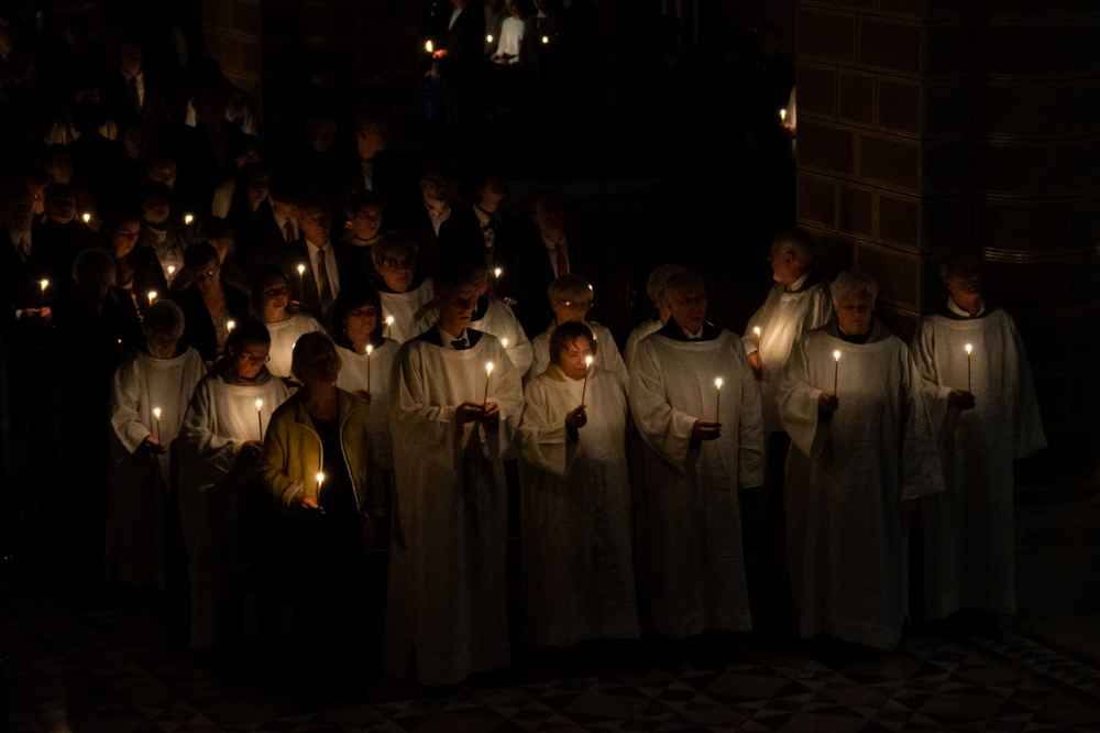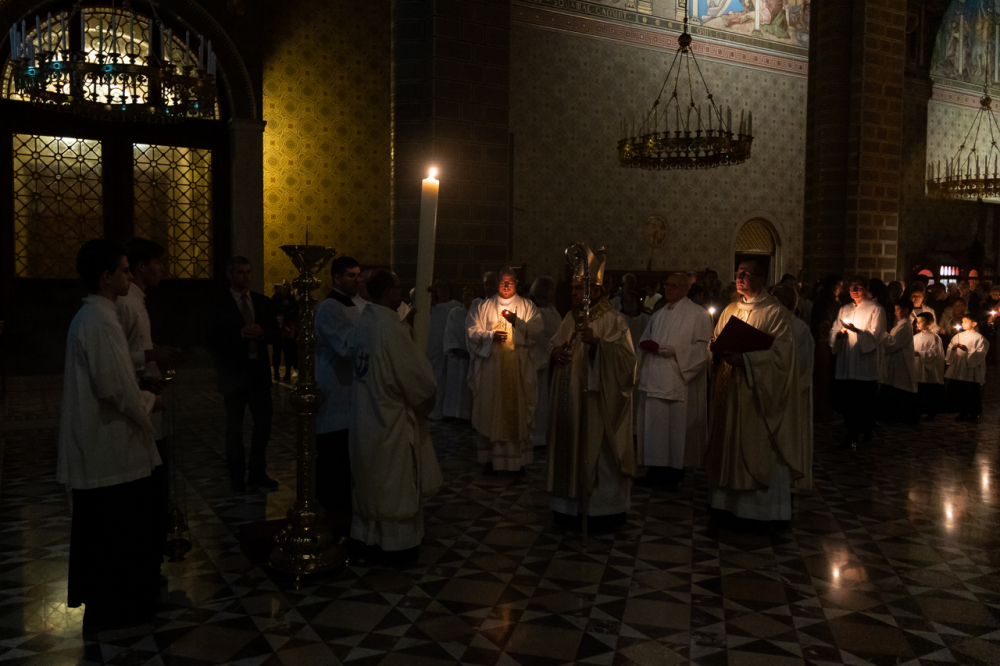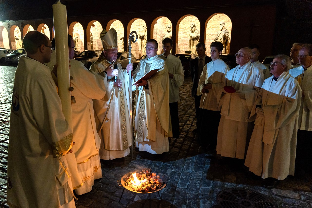 A főpásztor és asszisztenciája csendben vonult be a templomba húsvéti gyertyával, melynek lángját a hívek egymásnak adták tovább, a fellobbanó gyertyaláng fénye pedig lassanként betöltötte a székesegyházat, szimbolizálva Jézus dicsőséges feltámadását. Miközben a menet a húsvéti gyertyával a szentély elé érkezett, háromszor hangzott fel a Megváltó feltámadott életét ujjongva hirdető ének: Krisztus világossága! Istennek legyen hála!