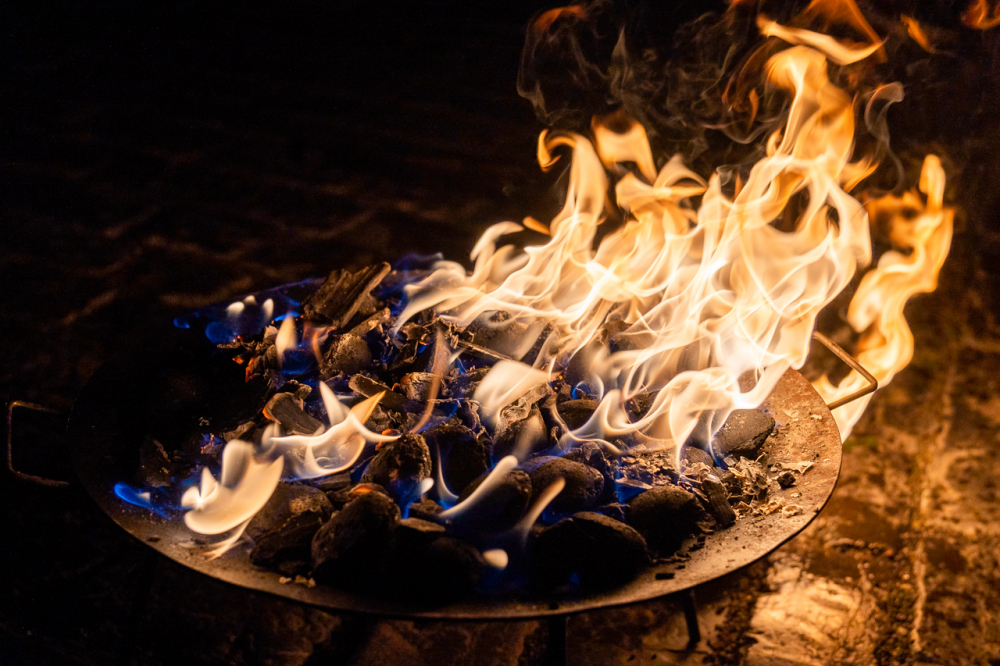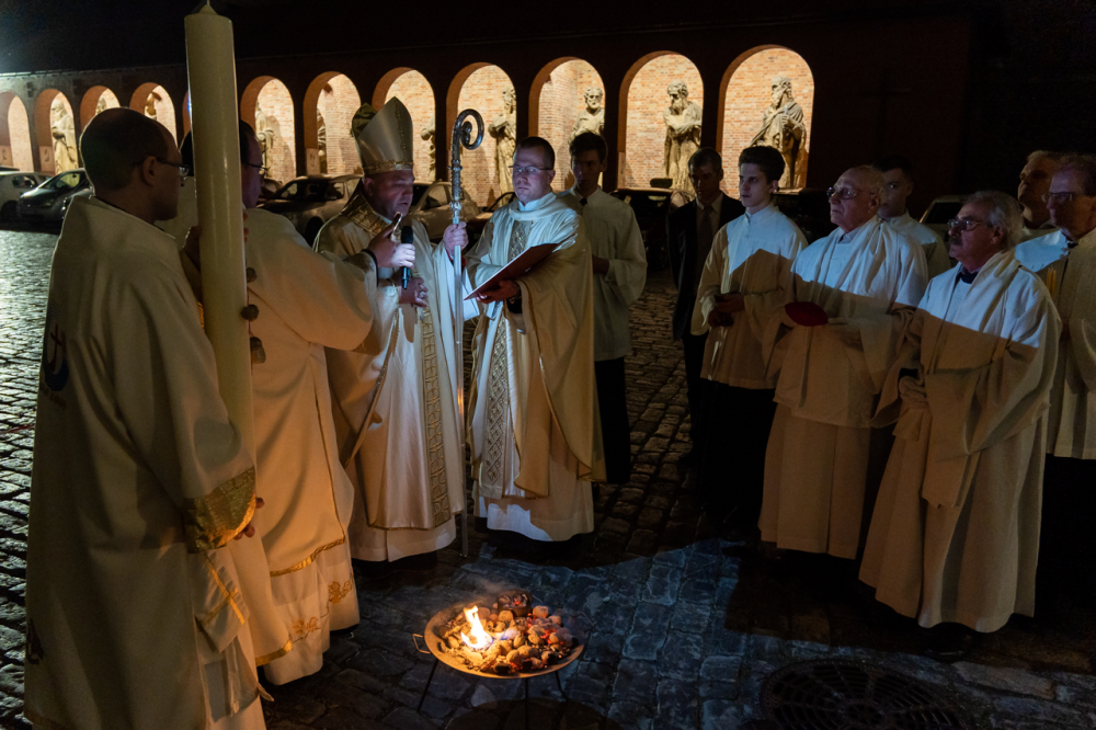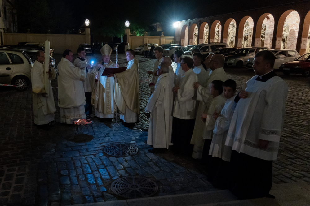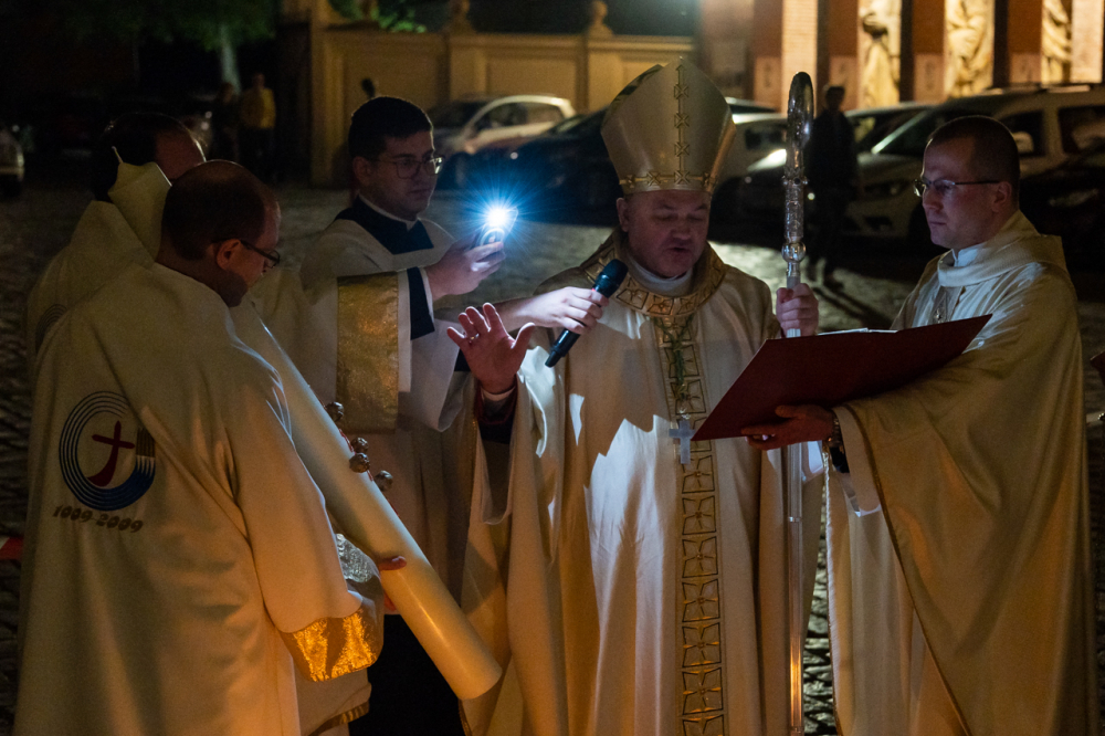 A szimbólumokban rendkívül gazdag liturgia kezdetén a sötétbe burkolózó templom előtti téren Felföldi László püspök a tűzszentelés szertartásában megáldotta a tüzet, melynek lángjával meggyújtották a Jézus élettelen testét szimbolizáló húsvéti gyertyát.