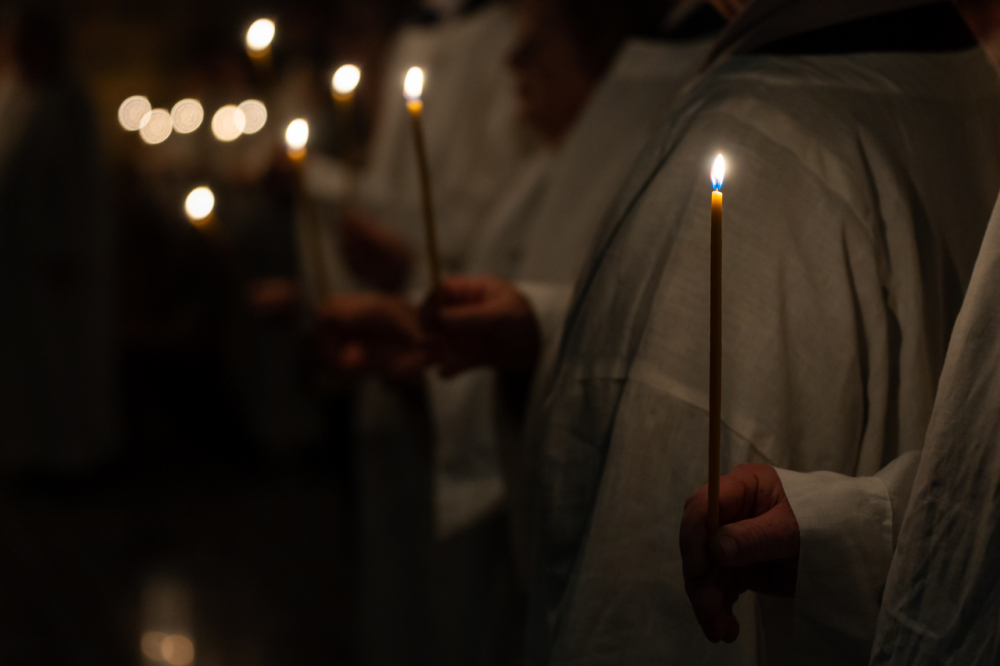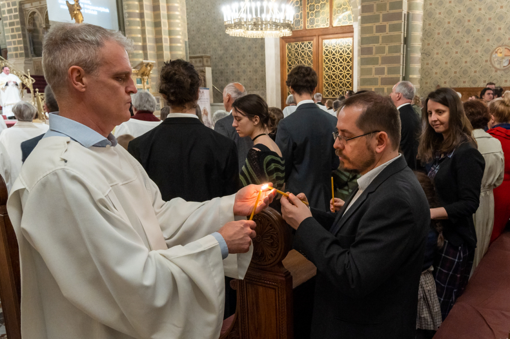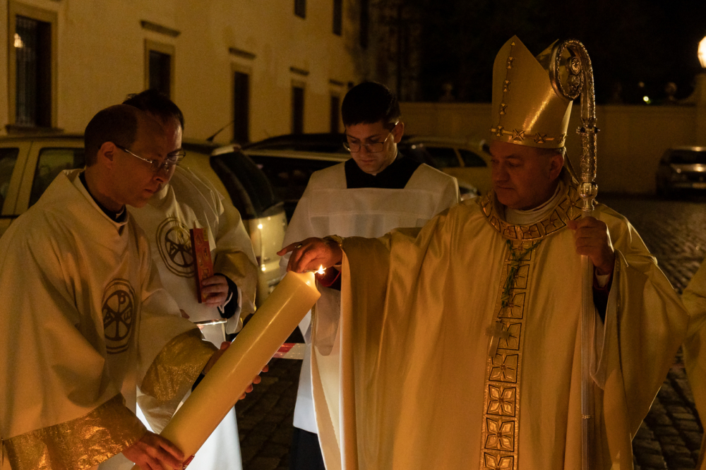 Az a félelem, amit nem lehet legyőzni fegyverrel, amit nem lehet legyőzni okoskodással, az a sötétség, amit egyedül és kizárólagosan Krisztus világossága képes legyőzni, egyetlen szál gyertya világával. Nehéz fénynek lenni és elhinni, hogy képesek vagyunk mások életébe világosságot, fényt hozni, mert sötétségben vagyunk. De a magunk parányi fényét át tudjuk adni, meg tudjuk vele gyújtani a másik ember gyertyáját és akkor fény születhet. Ez nem a szokványos húsvét éjszaka, hanem a létkérdés éjszakája, az embernek maradás éjszakája, az emberiség nagy családja, a Földünk, mint közös otthonunk megmaradásának titka múlik rajta.