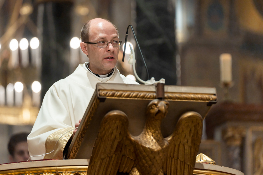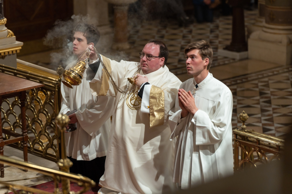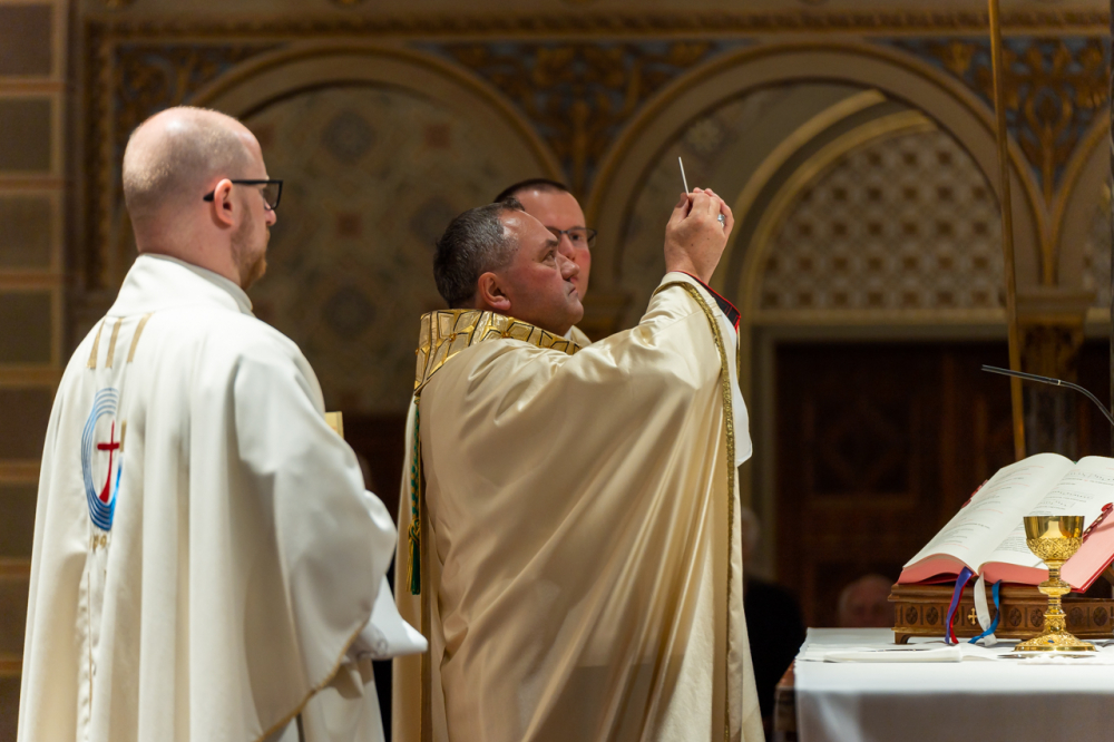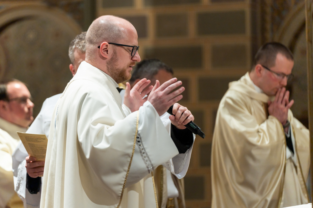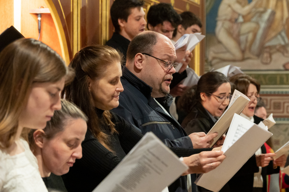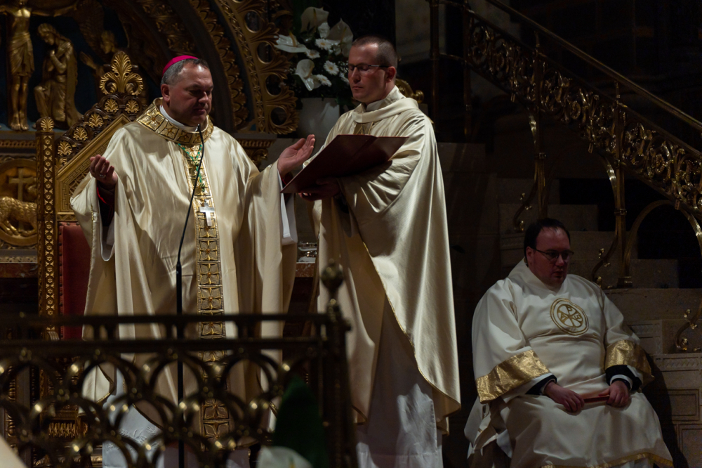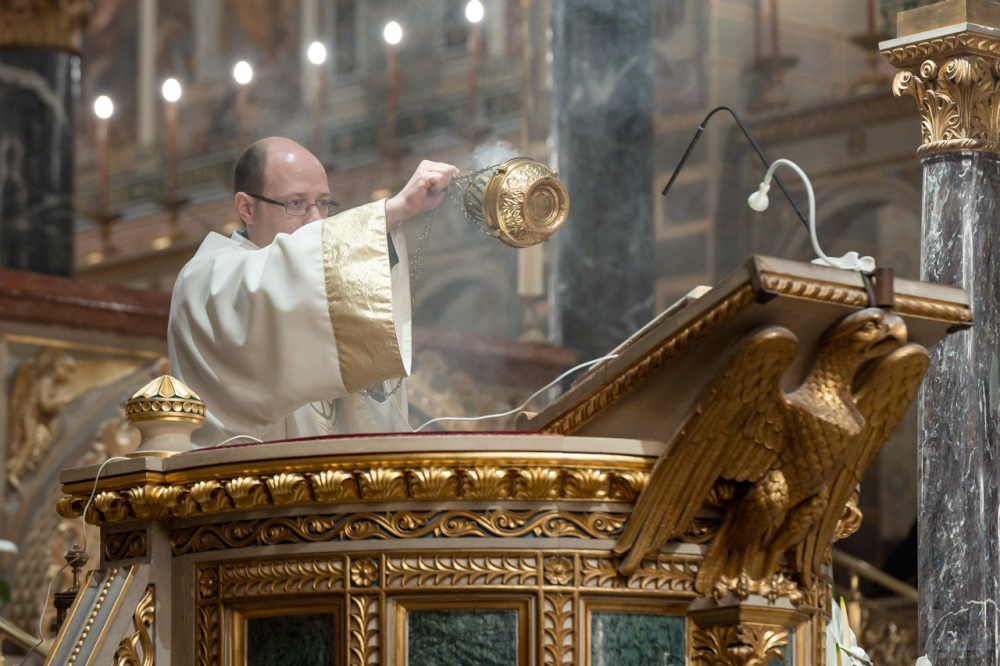 A liturgiában felcsendült az Exultet gyönyörű éneke, mely a húsvéti öröm kiáradását közvetítve sorolja fel az életünket átalakító kegyelmeket, melyek a húsvéti éjszakán fakadtak.
