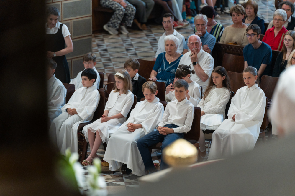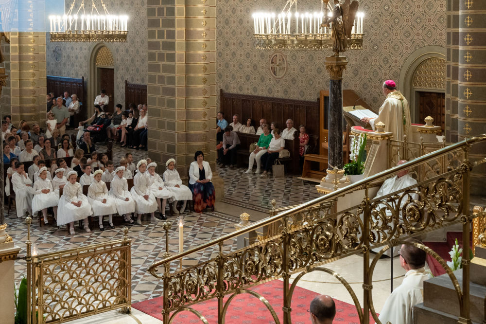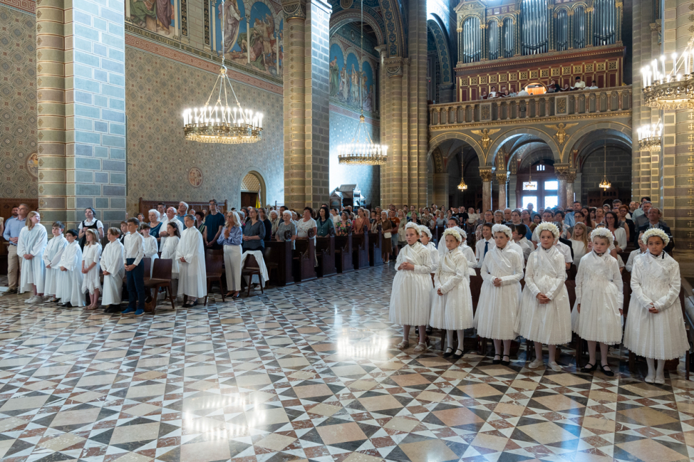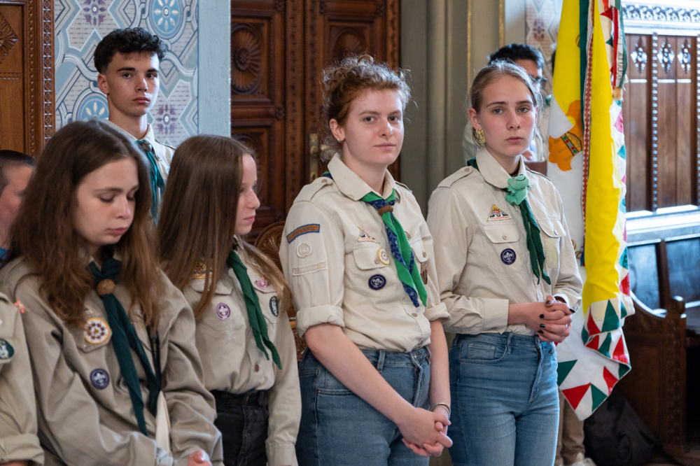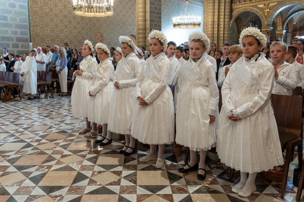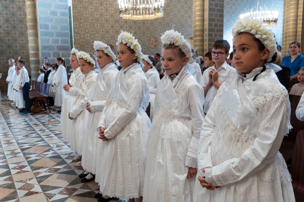 A püspök külön köszöntötte az erre az alkalomra gyönyörű ünnepi viseletbe öltözött elsőáldozókat, valamint a cserkészeket is.