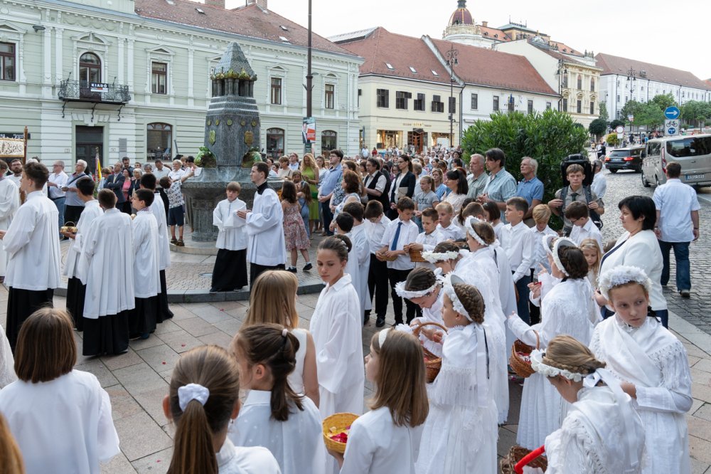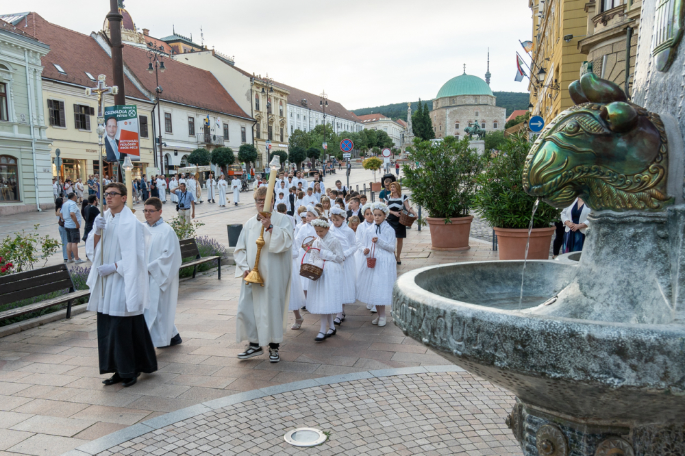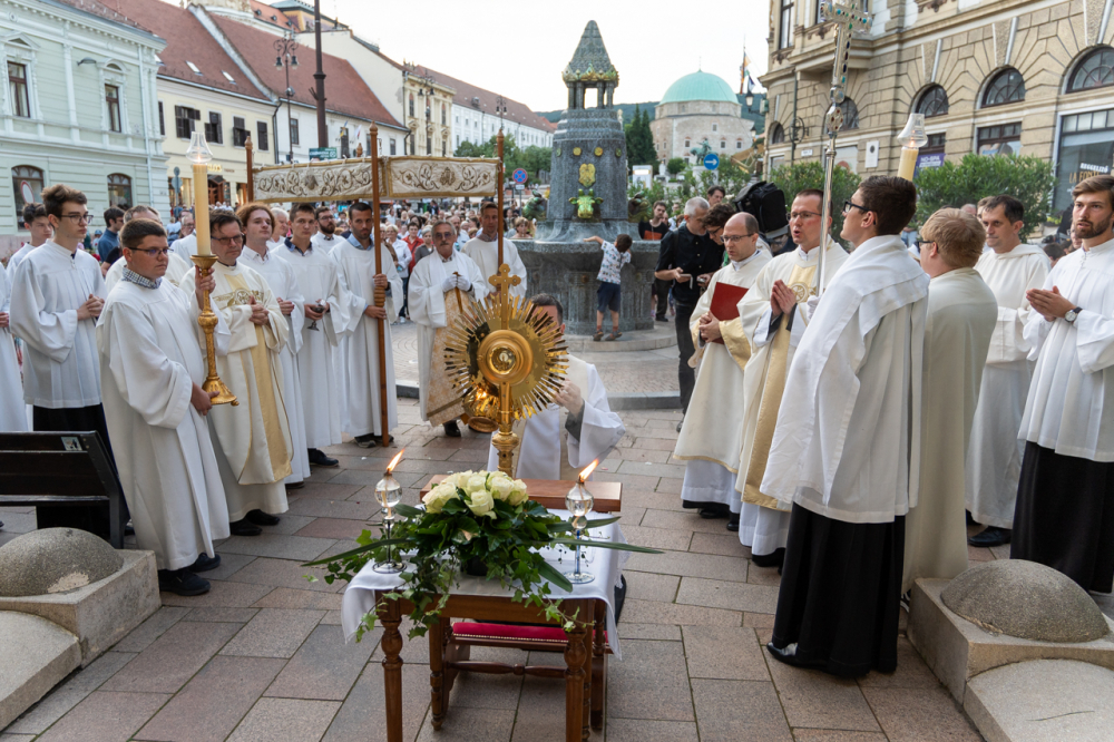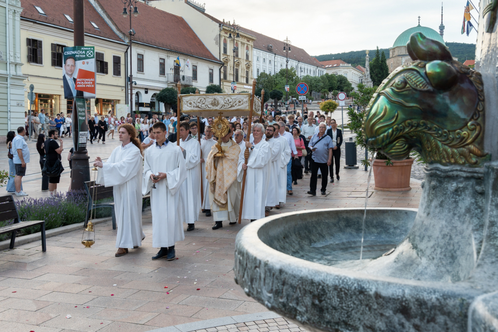 Úrnapja estéjén, június 2-án Felföldi László megyéspüspök celebrált ünnepi szentmisét a pécsi Szent Péter- és Szent Pál-székesegyházban, majd a főpásztor vezetésével körmenet kísérte az Oltáriszentséget a Széchenyi téren található Szentháromság-szoborhoz. A liturgián koncelebrált Máger Róbert püspöki irodaigazgató, a székesegyház plébánosa és dr. Simon-Wagner István, a pécsi Szent Ferenc-templom plébánosa, helyettes bírósági helynök.