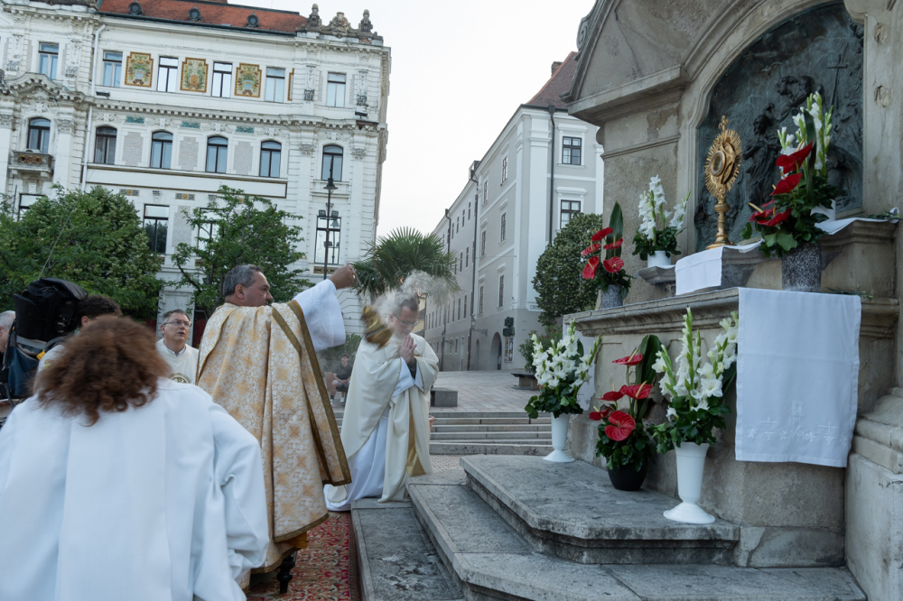 A menet a Dóm téren a székesegyháznál, a ferencesek templománál, majd pedig az Irgalmasok templománál felállított, virággal díszített oltárnál állt meg, ahol egy-egy evangéliumi részletet olvastak fel, majd áldásban részesítették a híveket. Az úrnapi körmenet és tanúságtétel a Széchenyi téri Szentháromság-szobornál felállított oltárnál ért véget.