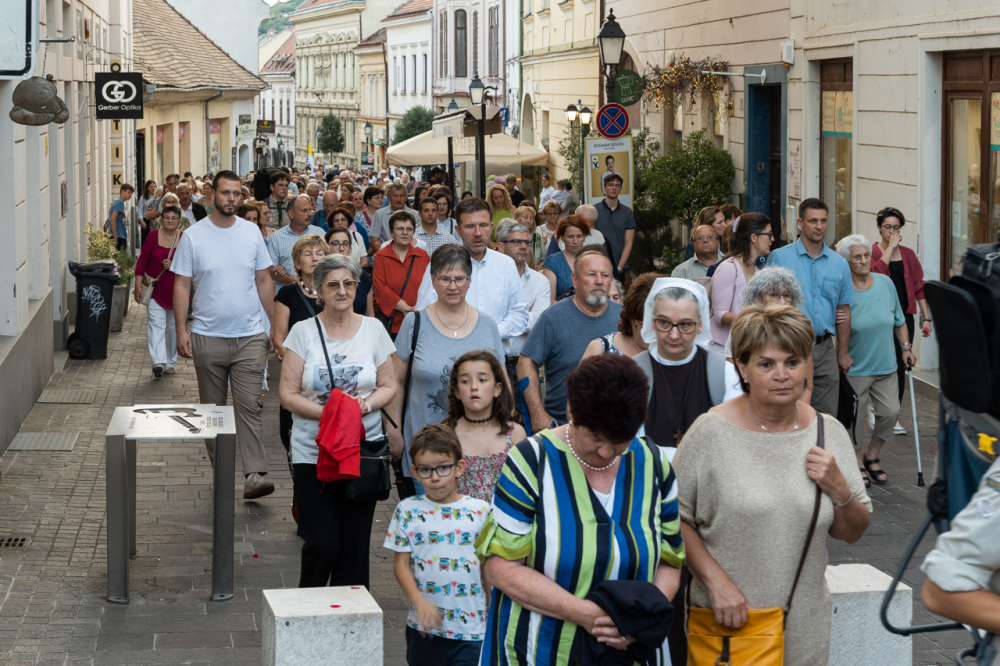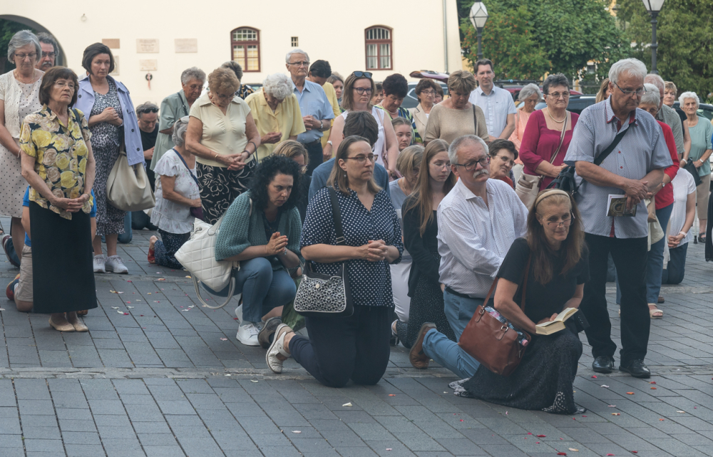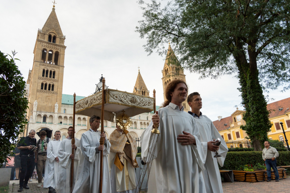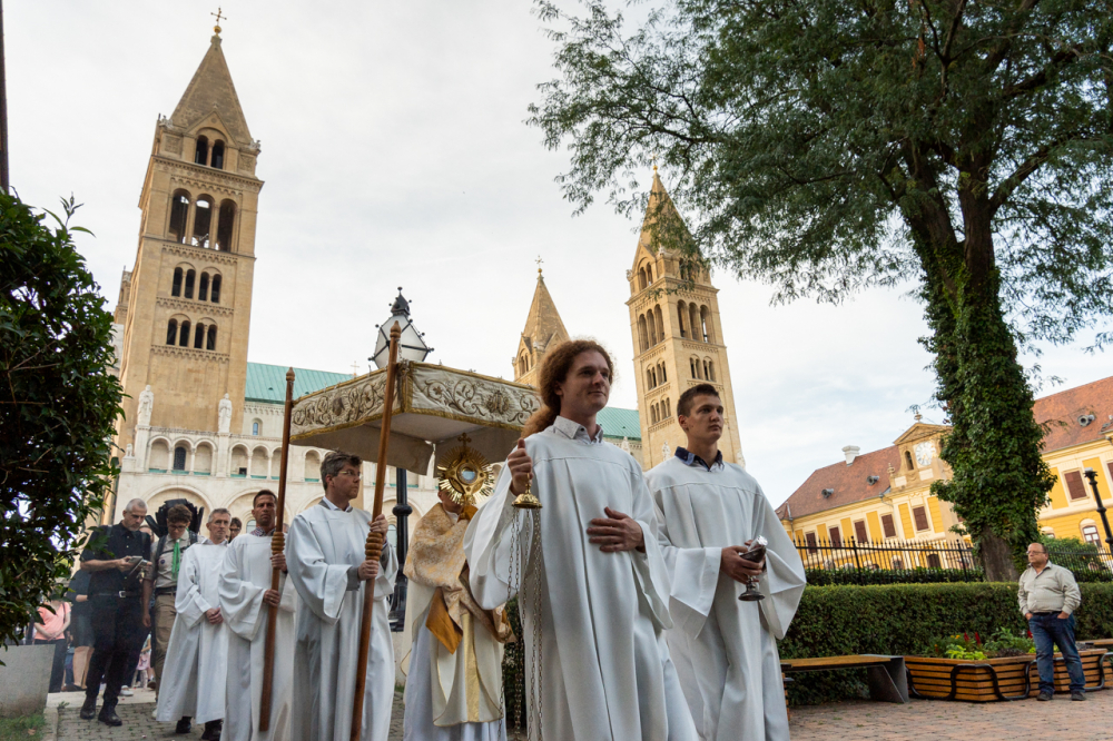 A körmenetben azt üzenjük a világ felé, hogy Krisztusnak van válasza az élet nagy kérdéseire, az élet nagy éhségére, csak oda kell menni hozzá, kapcsolatot kell vele teremteni és engedni, hogy megszólítson, akarni kell, hogy tápláljon és hallgatni a szavára, hogy követésére indítson mindnyájunkat – fordult az ünneplő sokasághoz Felföldi László pécsi püspök, aki szokása szerint egy verssel zárta elmélkedését. Ezúttal a paplköltő, Sík Sándor Tekintet nélkül című versének sorait idézte: