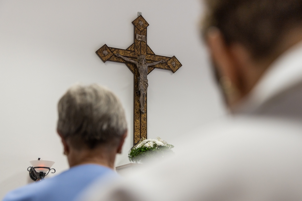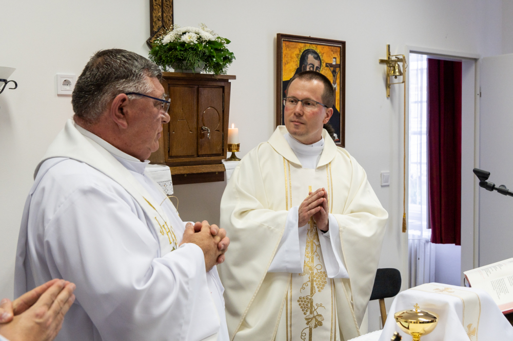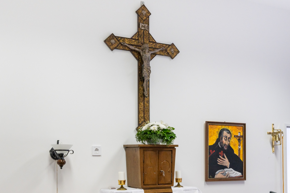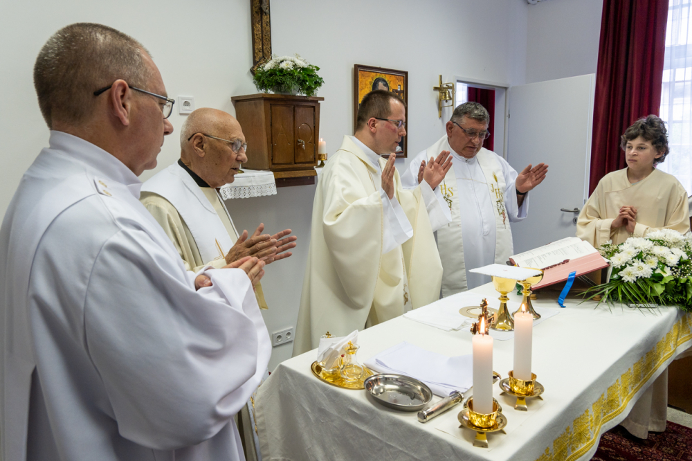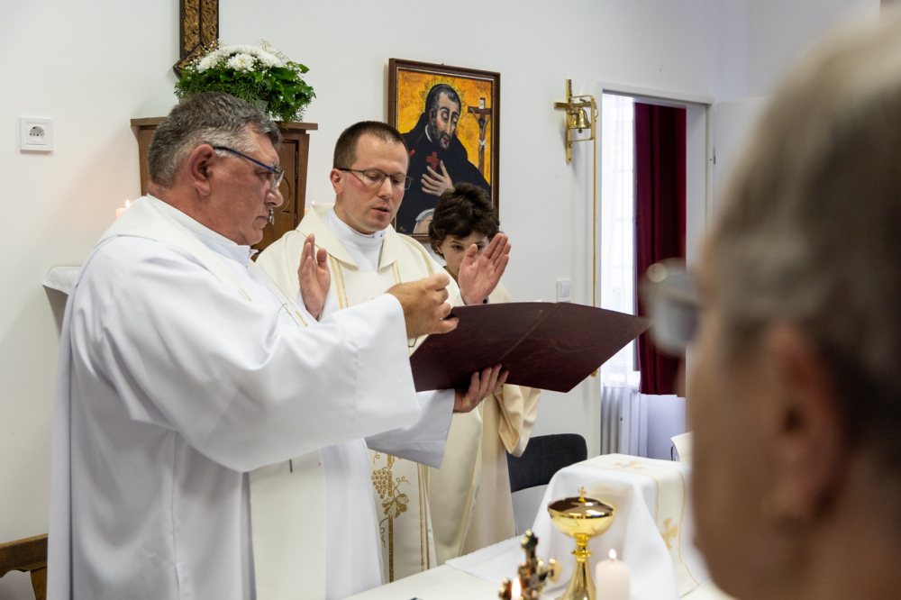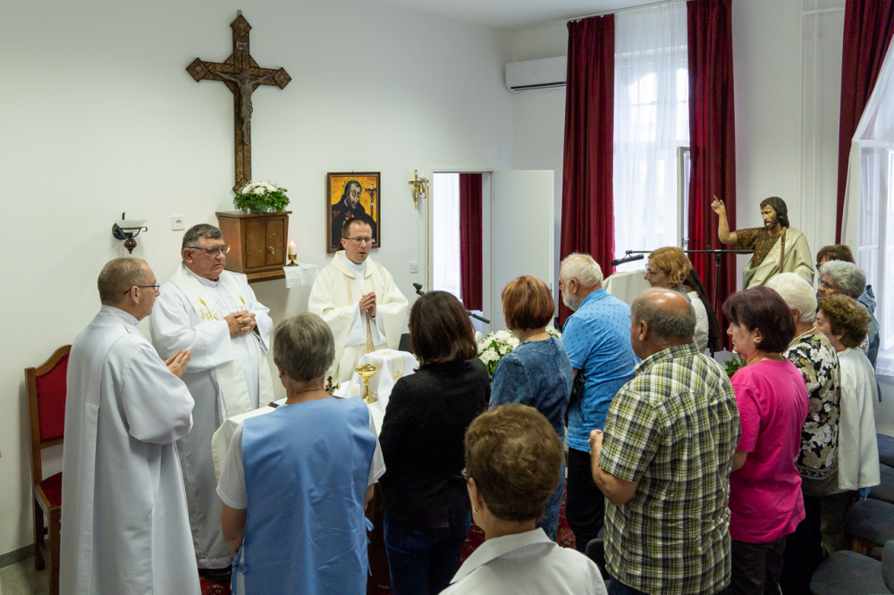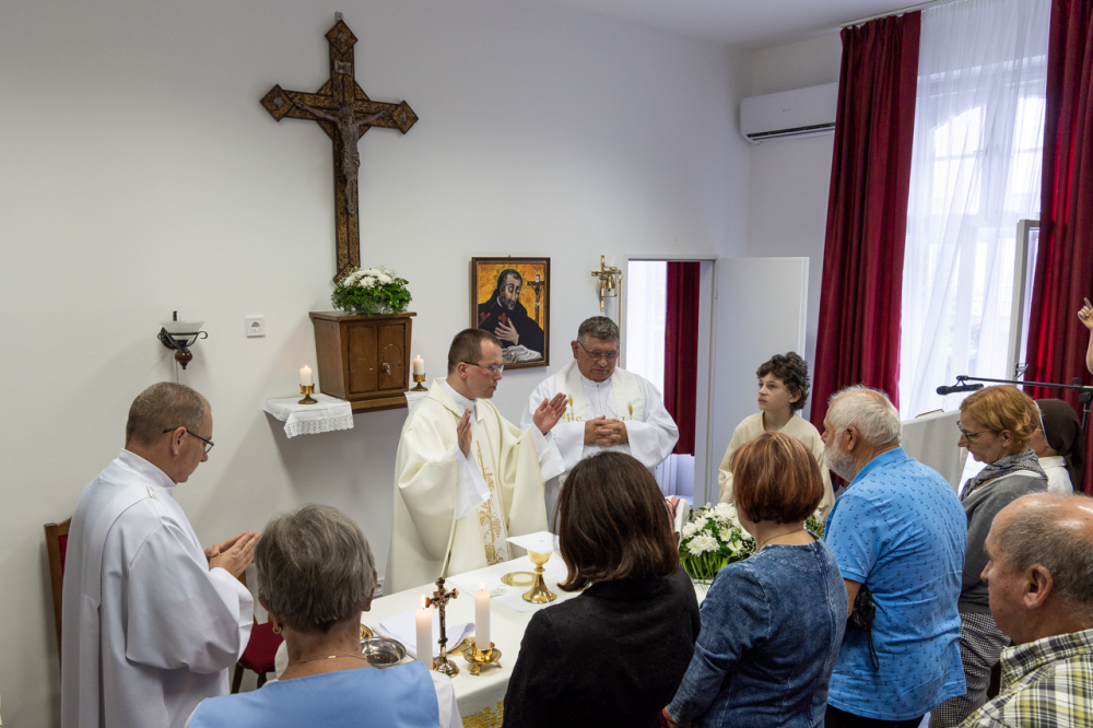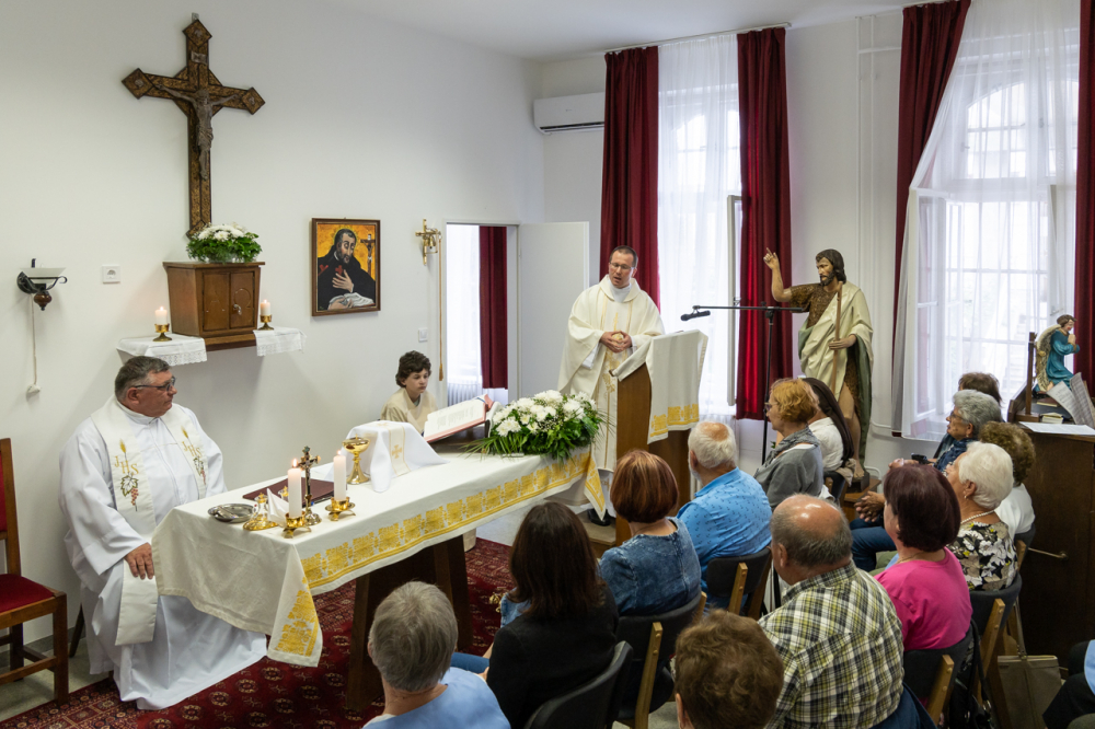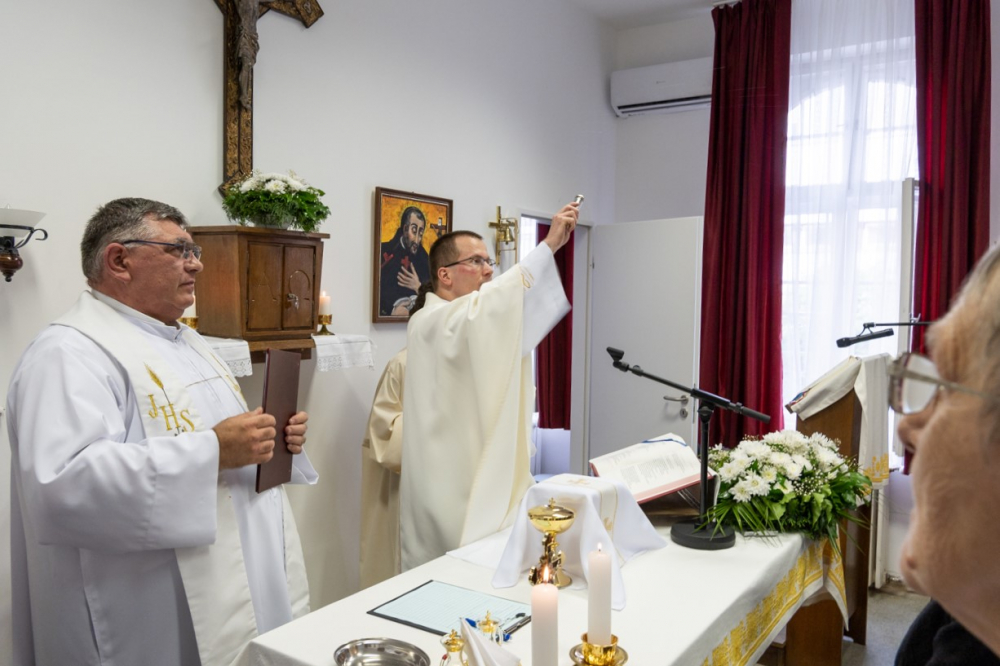 Az újonnan kialakított szakrális térben Máger Róbert vizet szentelt, majd a szentelménnyel megáldotta a kápolnát, meghintve annak oltárát és falait. A plébános szentbeszédében elmondta, a kápolna a megnyugvás helyszíne, ahol az Úristennel találkozunk. Egy kórházi kápolna pedig különösképpen azt hirdeti, hogy az Isten minden élethelyzetünkben jelen van, nem hagy magunkra a szenvedésben, betegségben, megpróbáltatásokban, amelyekkel mindnyájan szembesülünk.