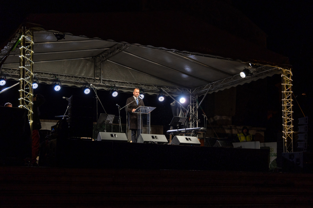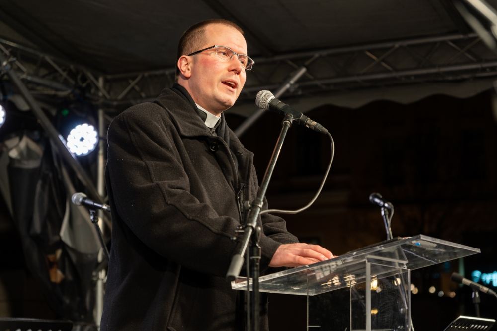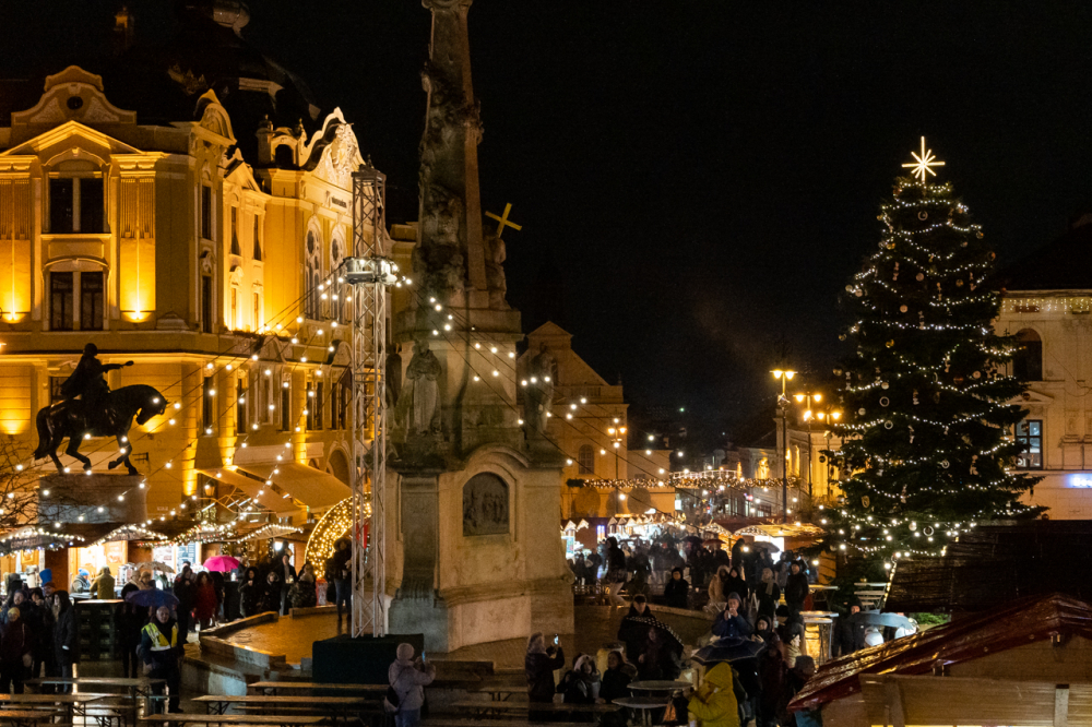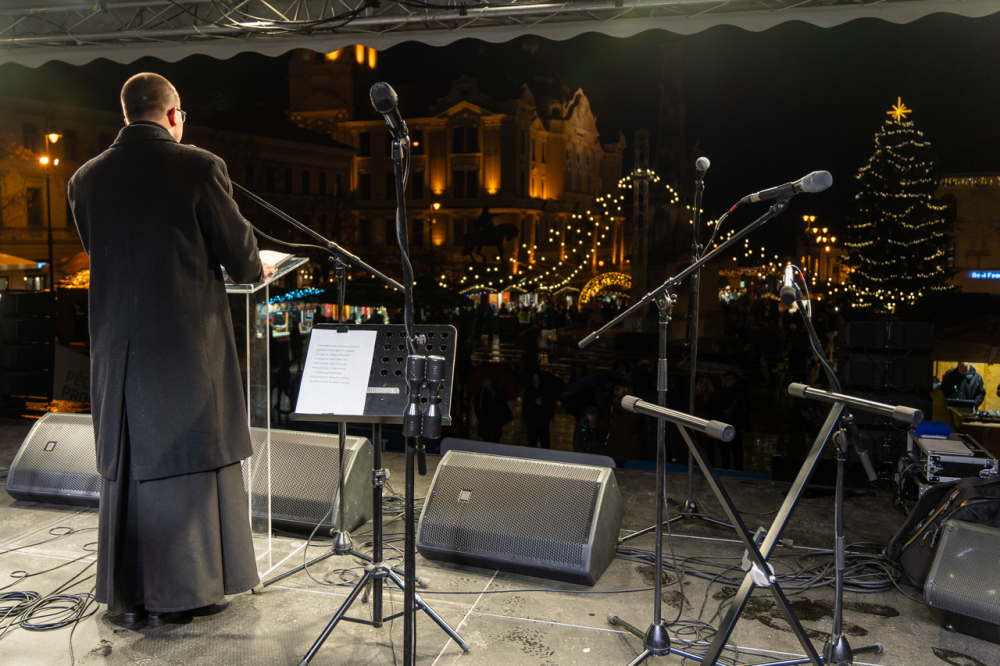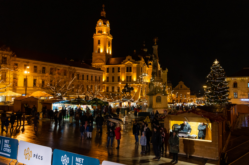 Az ünnepi fények felkapcsolását követően ünnepi díszbe öltözött pécsi főtéren Máger Róbert beszédében kiemelte, hogy a Megváltó születésének ünnepére való készület reménnyel tölt el mindnyájunkat és ennek az idén különleges aktualitása van.