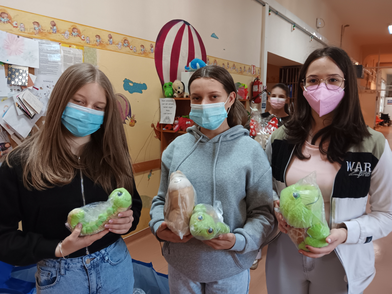 Az adományba szánt plüssöket a tamási Würtz Ádám Általános Iskola 7.a osztályos tanulói személyesen adták át a beteg gyermekeknek, akik kissé megszeppenve, de boldogan fogadták a játékokat.