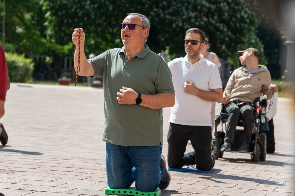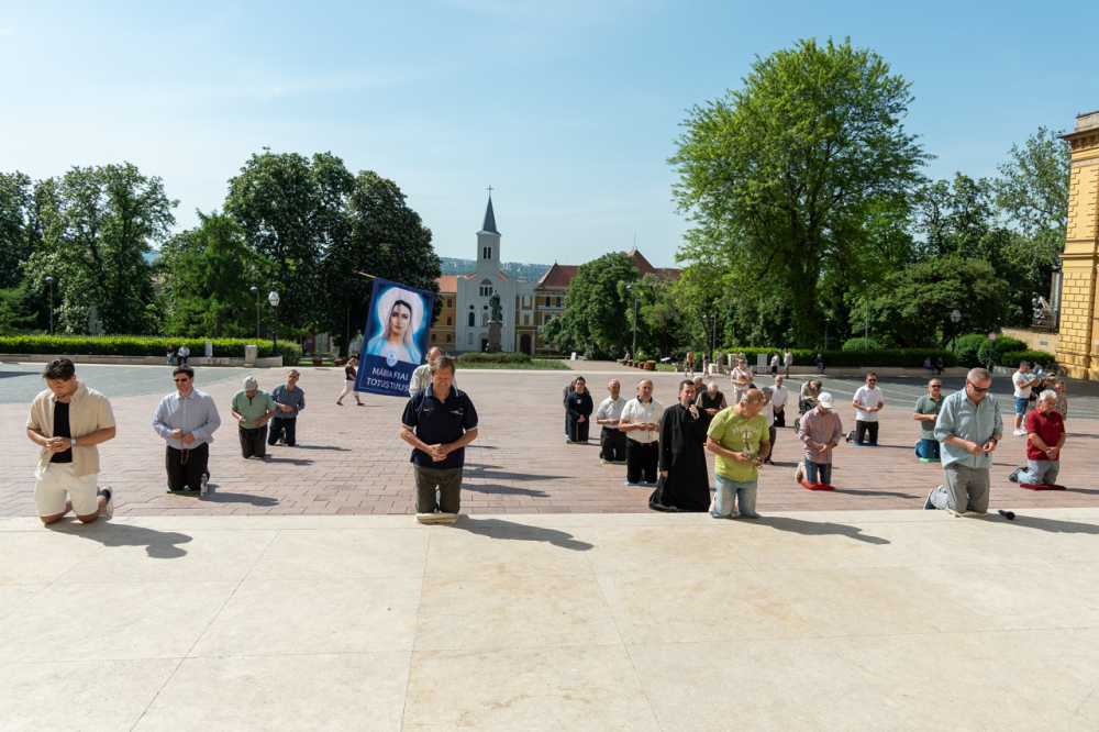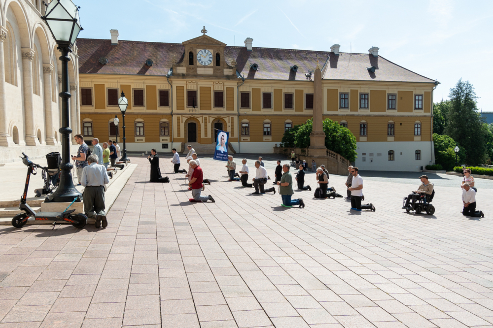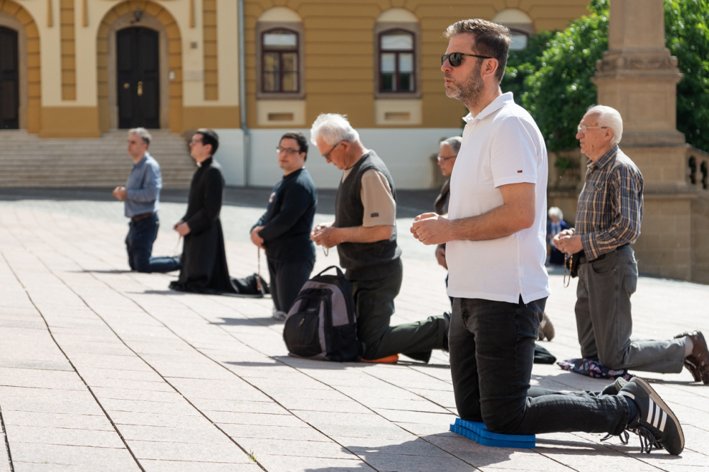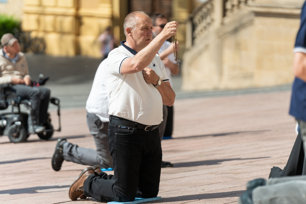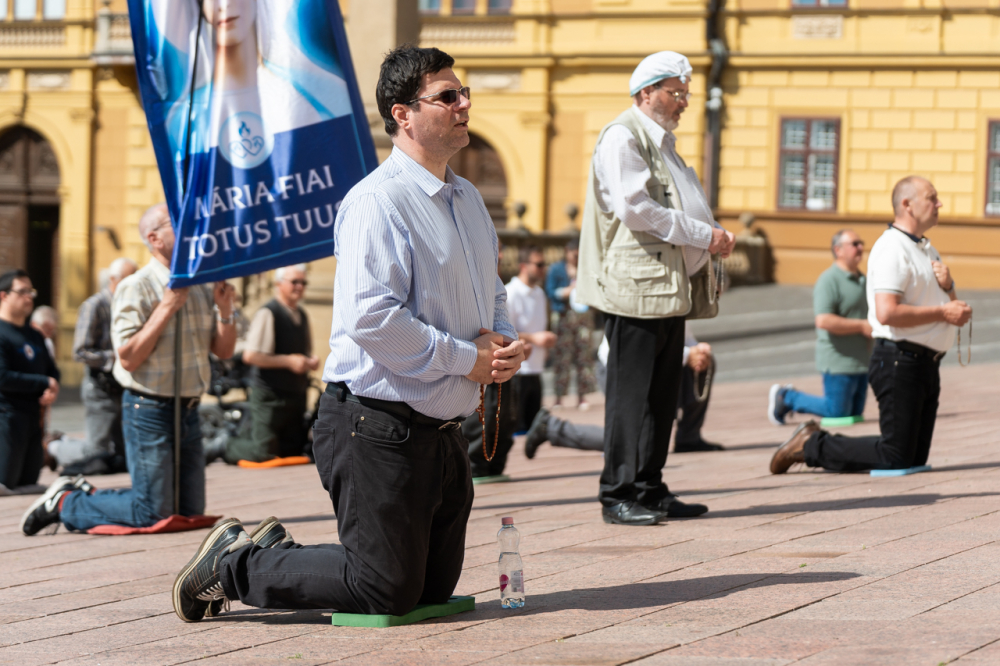 A Férfi TÉRdeplő Rózsafüzér Szövetség és Misszió imaláncához csatlakozva május 3-án, immár második alkalommal tartották meg a férfiak térden állva mondott elsőszombati rózsafüzér imádságát a pécsi székesegyház melletti Dóm téren.
