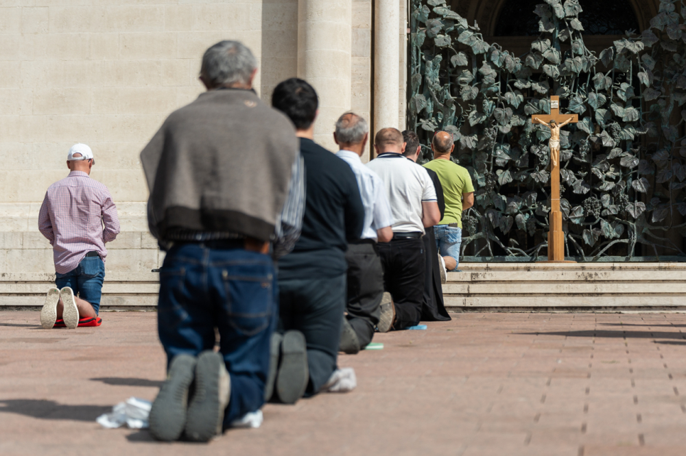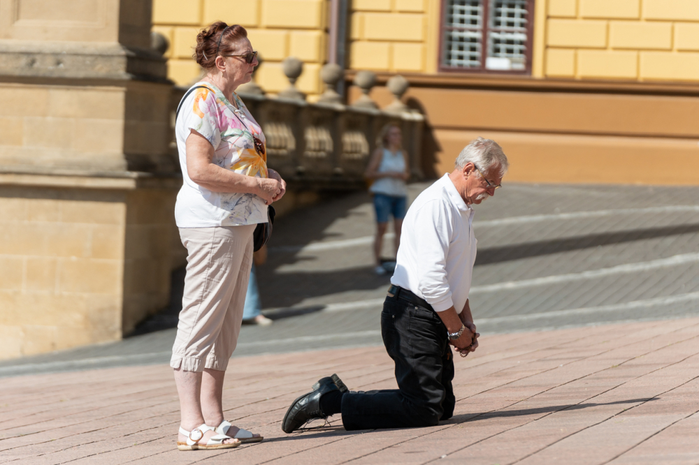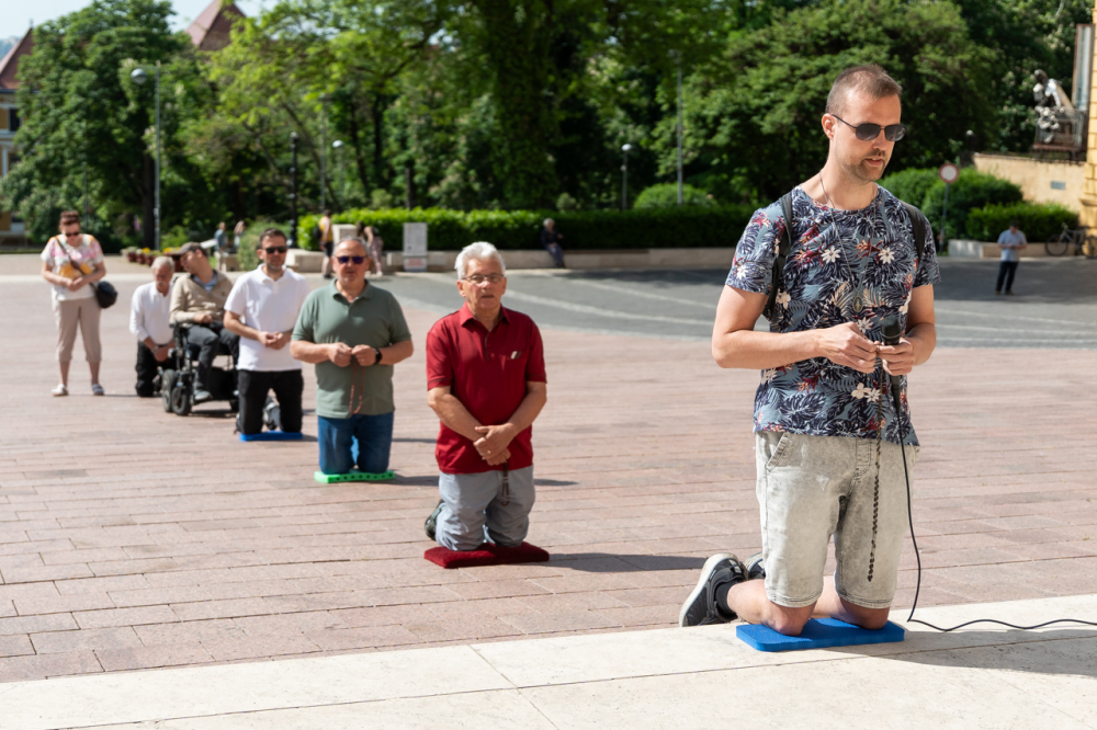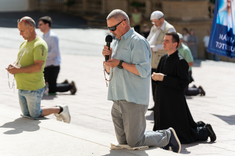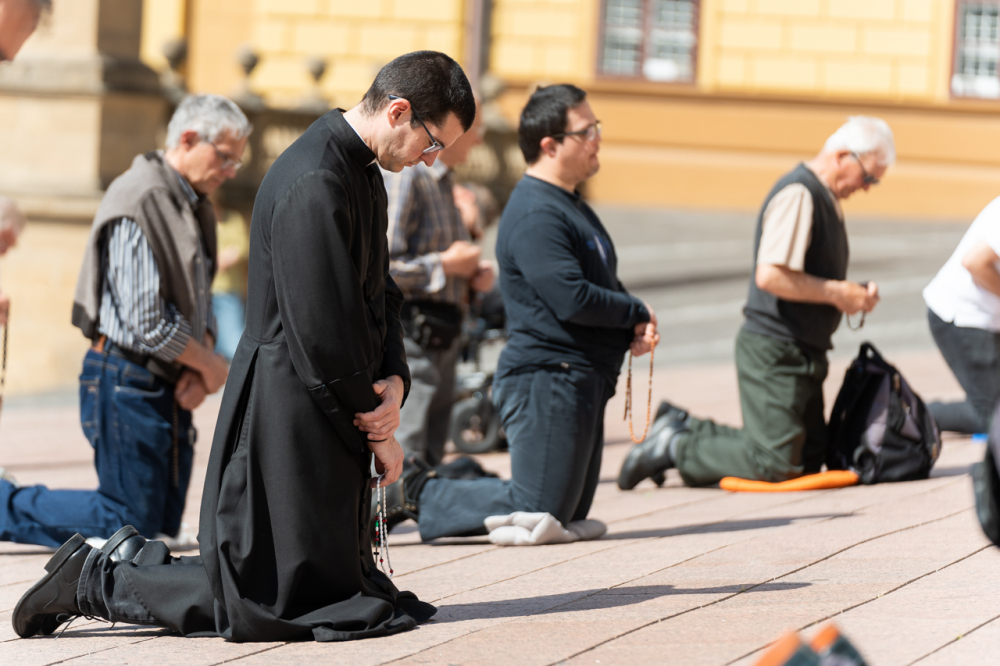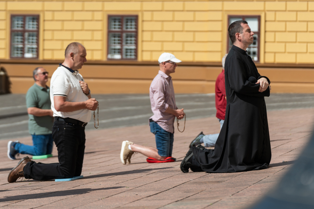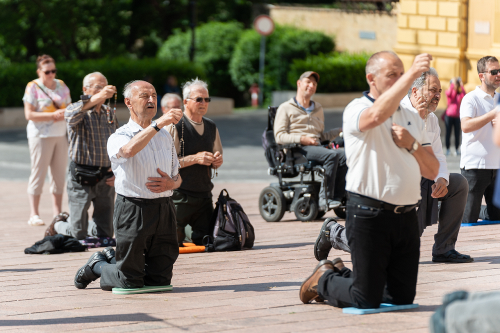 A Férfi TÉRdeplő Rózsafüzér Szövetség és Misszió imaláncához csatlakozva május 3-án, immár második alkalommal tartották meg a férfiak térden állva mondott elsőszombati rózsafüzér imádságát a pécsi székesegyház melletti Dóm téren.
