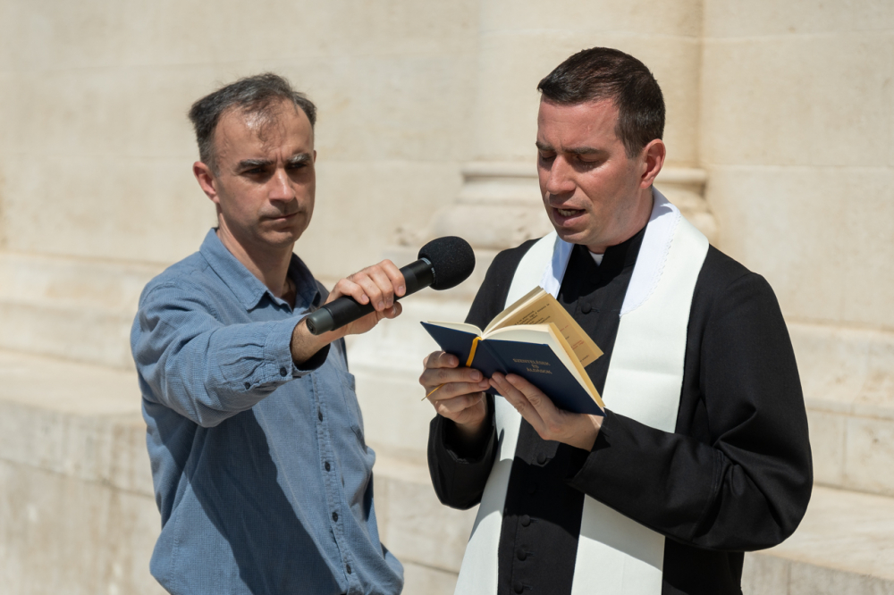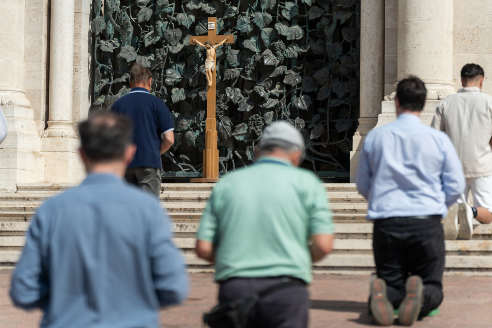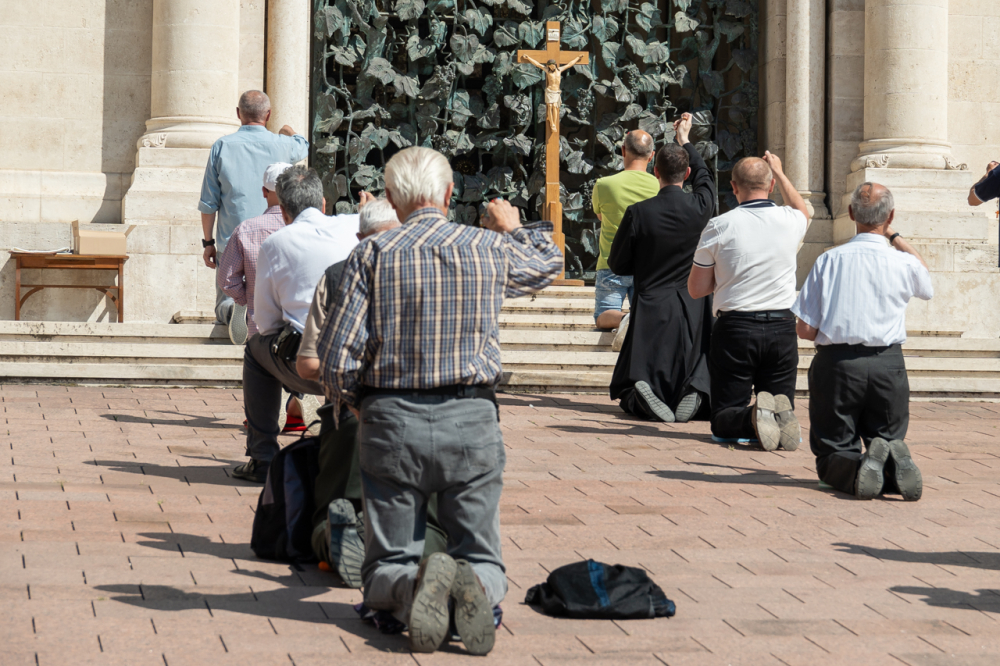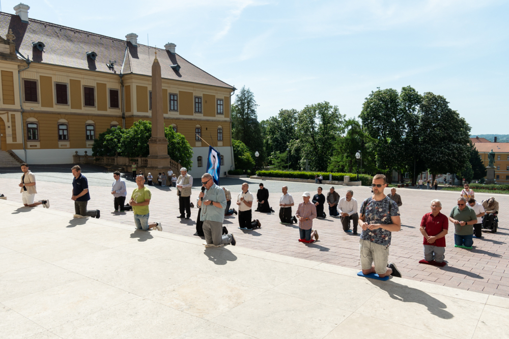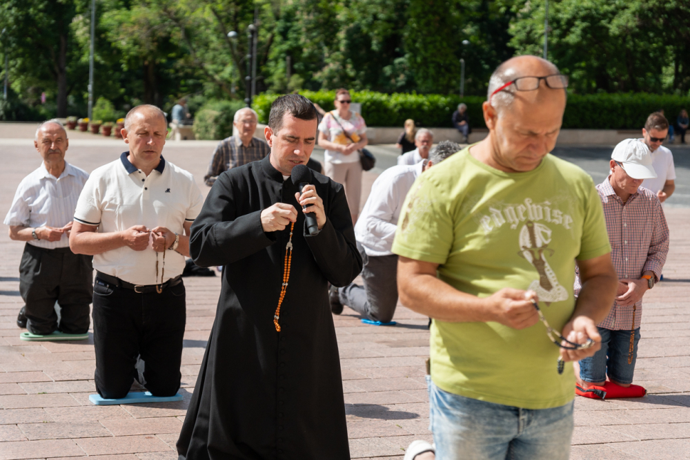 A bazilika déli kapuja elé felállított kereszt előtt ezúttal mintegy 25 férfi, fiatalok és idősebbek imádkozták együtt a szentolvasót dr. Fekete Zoltán székesegyházi káplán vezetésével. A férfiakkal együtt imádkozott Molnár Erik püspöki titkár is, valamint ezúttal is csatlakoztak nők is az imádsághoz.