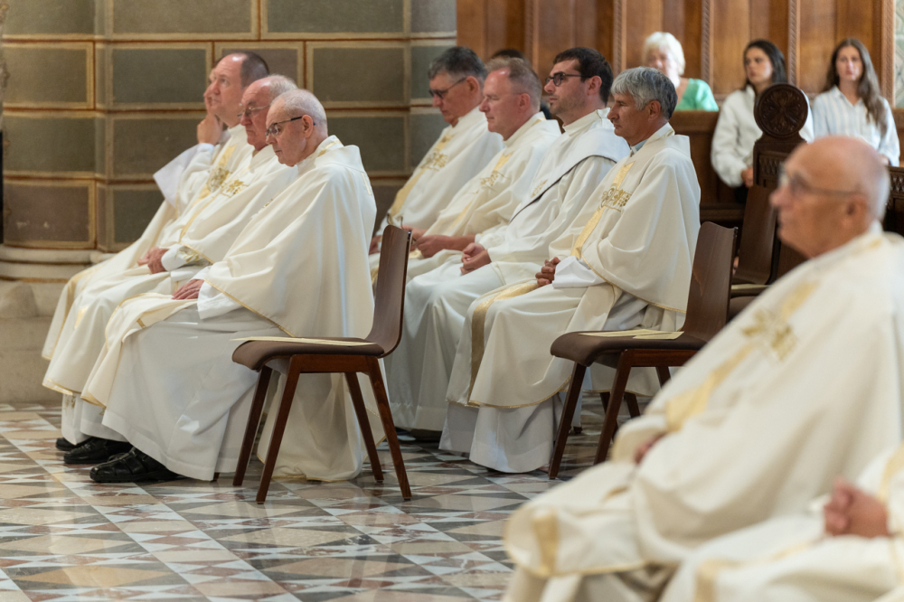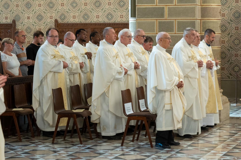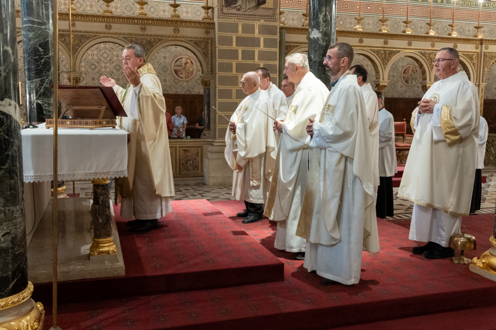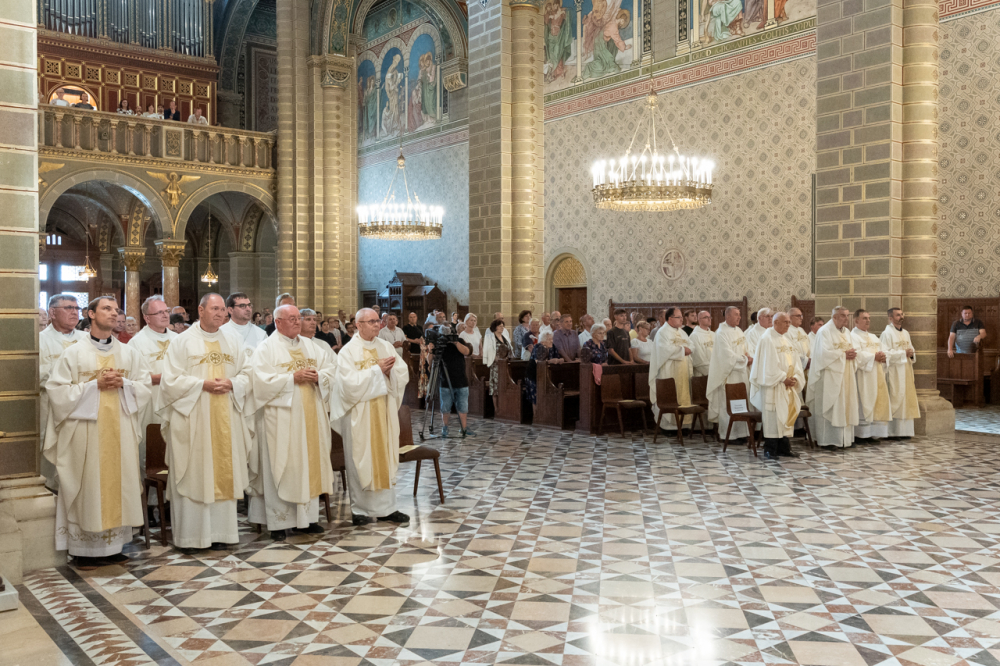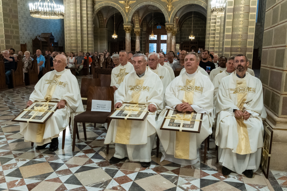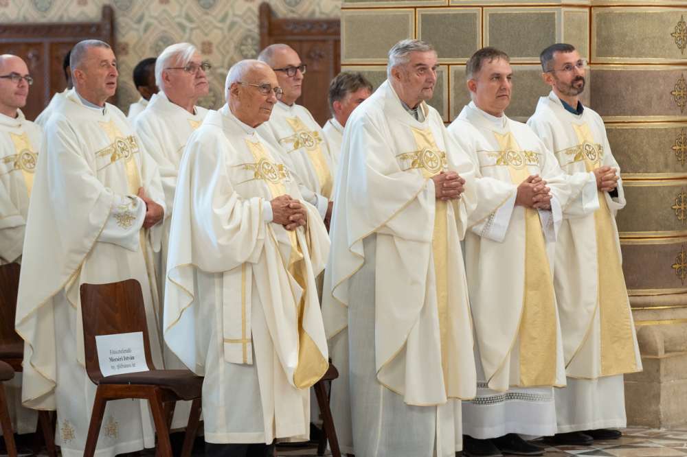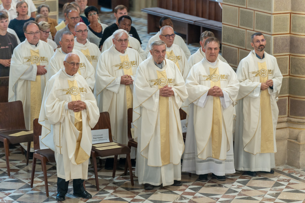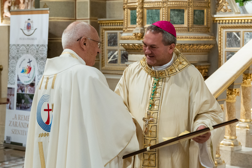 Felföldi László pécsi megyéspüspök köszöntőjében úgy fogalmazott, hálaadásra gyűltek ezen a sokszoros ünnepen, melyben a Pécsi Egyházmegyét és annak ügyeit évtizedeken át hordozó papokat ünneplik.
