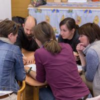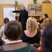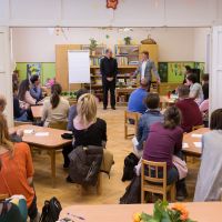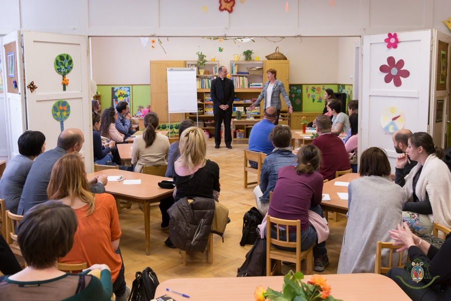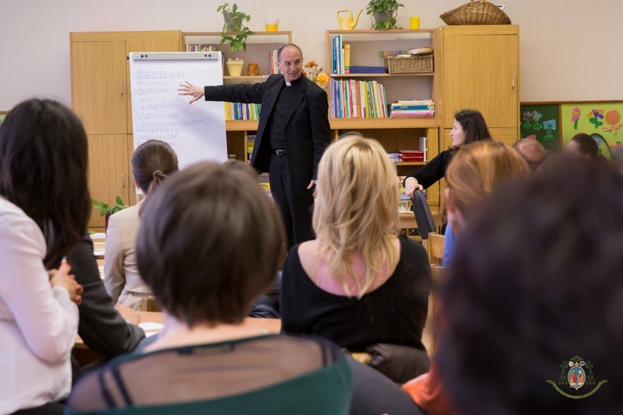 Az előadásra Tomposné Kovács Edit óvodavezető meghívta a jelenleg az intézménybe járó és a következő nevelési évtől felvételt nyert gyermekek szüleit is. A szülők aktívan bekapcsolódtak az ismerkedést követő csoportmunkába, amely során a főpásztor kérésére összegyűjtötték a gyermekek nevelésénél a későbbi életkorokban is fontosnak tartott emberi értékeket. Arról gondolkodtak közösen, milyennek szeretnék nevelni gyermekeiket, milyen tulajdonságok a legfontosabbak számukra. Udvardy György az összegyűjtött értékek mentén folytatta előadását, kiemelve a szülők tudatos felelősségvállalását a gyermeknevelésben és a hitben való elmélyedésben, növekedésben.