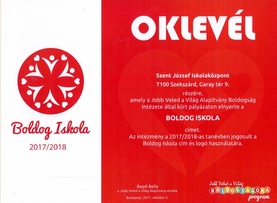 A szekszárdi Szent József Iskolaközpont sikeres pályázatot nyújtott be a Jobb Veled a Világ Alapítvány által működtetett Boldogság Intézet felhívására, így az intézmény az idei tanévtől jogosult a Boldog Iskola cím viselésére.