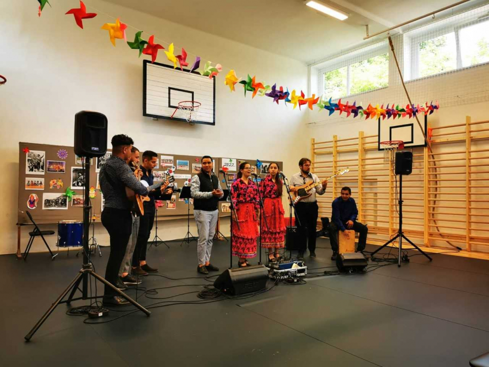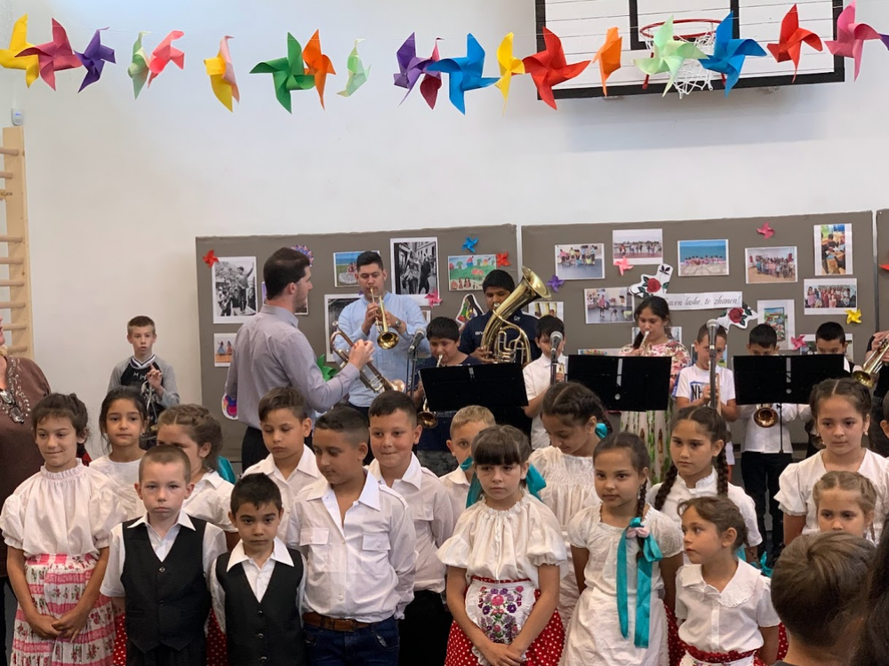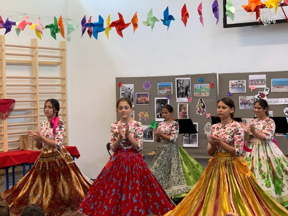 A műsorban mindenki felállt és kórusunk a Symphonia program tanárai által vezetett zenekarunkkal közösen elénekelte a nemzetközi cigány himnuszt. A Gandhi Gimnázium Hagyományőrző Együttese pillanatok alatt elbűvölte a közönséget. A zenekart négy fiú és tanárjuk alkotta, ők könnyed eleganciával kísérték a fiút és két lányt, akik csodálatos viseletben álltak a nézők előtt és erős, csengő hangjukkal betöltötték a termet. Sajnos nem maradhattak a műsor végéig, várta őket a következő fellépés. Ezután iskolánk diákjaié lett a főszerep. Egymást váltották a színvonalas produkciók, kis tehetségeink minden területen bemutatták tudásukat, melyet rengeteg fotó és videó bizonyít. Zenekarunk kíséretében Nagy Norbert plébános és a tanári karunk egészítette ki a gyerekek kórusát és Schäffer Nikolett vezetésével előadtuk a csodálatos Ederlezi című szerb népdalt. A műsor végén zenekarunk szórakoztatta repertoárjával a közönséget, míg a tanárok felkészültünk meglepetés táncunkra, ezzel zárva a programot.