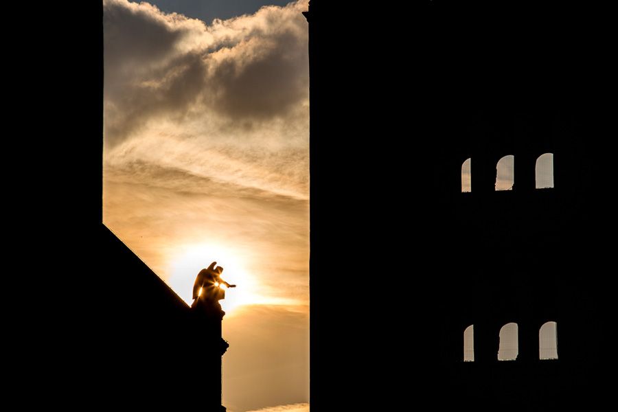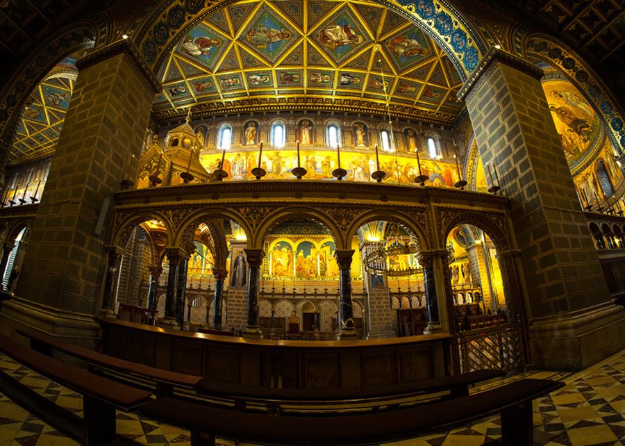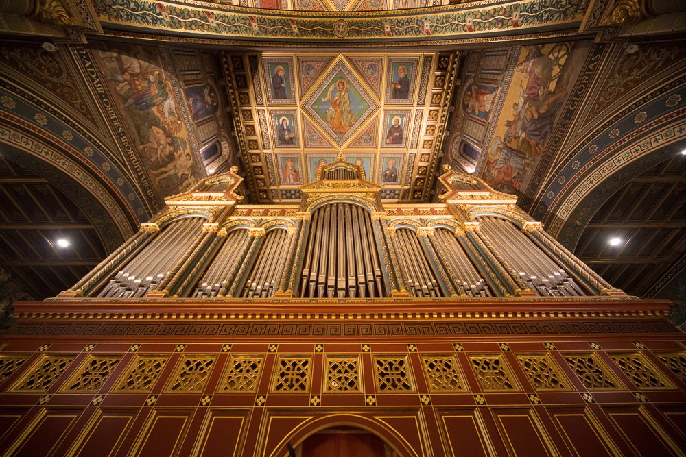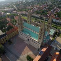 The magnificent baldachin main altar further enhances the immense space, by dividing it into two halves by the monumental arch as we enter. The choir can boast of a four-manual organ with over 6000 pipes, a masterpiece from the renowned Angster Organ Factory in Pécs. The Chapels of the Sacred Heart of Jesus and Corpus Christi are decorated by Karoly Lotz seccos. Additionally, we can observe the world famous Bertalan Székely seccos in both the Chapel of Mary and in the chapel of Saint Mór. The mortal remains of Janus Pannonius, a well-known Humanist poet and a former Bishop of Pécs, were rediscovered and then reburied during archaeological excavations in the enormous 12th century, cross-vaulted, five-nave crypt. A sculpture was erected in his memory at the same spot. There is a stunning view of the city from the south-eastern tower of the time-honoured cathedral, which has preserved the spirit of its thousand-year-old past so well.