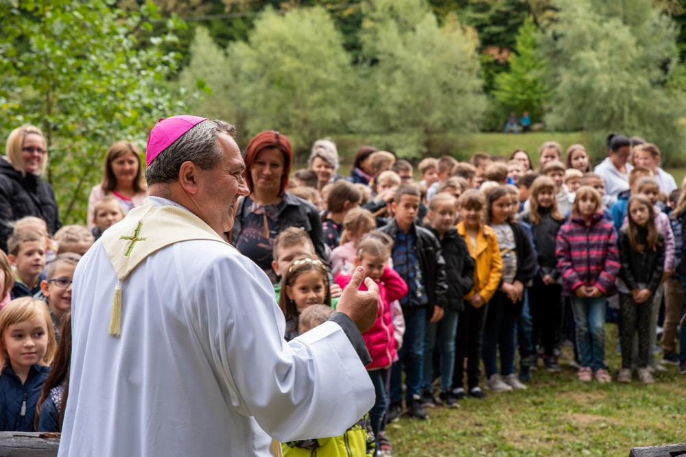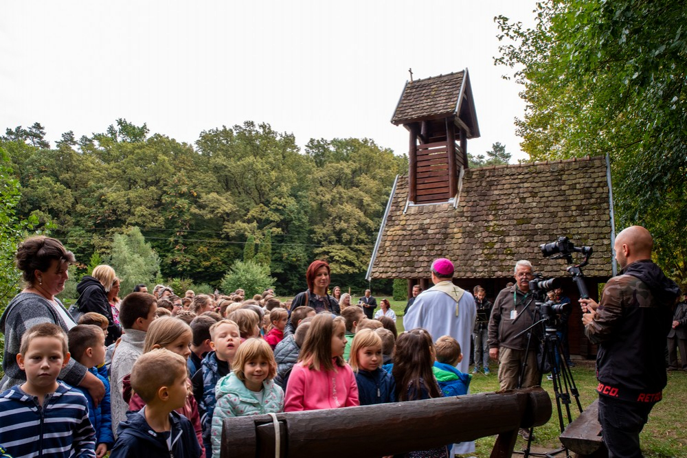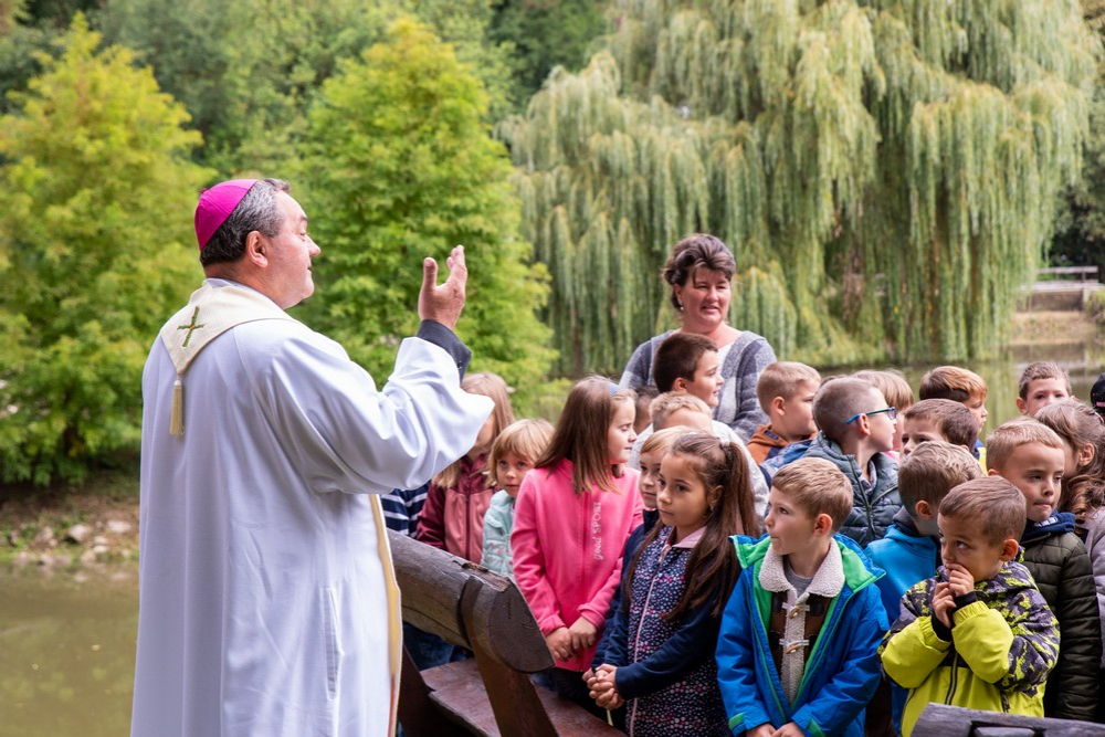 Felföldi László megyéspüspök beszéde elején köszönetet mondott a megszólalóknak, és kifejezte háláját a fellépő gyerekeknek. Szívhez szóló köszöntőjében emlékeztetett, hogy a Teremtő otthont ad nekünk. „A természet által üzenetében Isten azt tanítja, hogy emberek vagyunk. Segít, hogy magunkra találjunk. Amikor nehéz az élet, a természetbe kell visszatérni, mert aki elszakad a természettől, a földtől, elszakad a közösségtől, elveszíti önmagát. Az erdei kirándulás rendezi a lelket, erősíti a szívet. És ha közelebbről megfigyeljük a növényeket láthatjuk, hogy mindegyiknek van sebe, de mégis él és növekszik. Ilyen az ember is. Most ebbe a természetbe helyezzük a keresztet, melynek két üzenete a szenvedés és a szeretet. A környezet is egyensúlyban hordozza a szenvedést és a szeretetet. Ha ezek egyensúlyban vannak, akkor béke van. A növények nélkül lehetetlen lenne élnünk . Ha nem szeretjük a környezetet, magunkat nem szeretjük. Ha elpusztítjuk az erdőket, magunkat pusztítjuk el. Isten összekötött minket a teremtett világban. Hiszem, hogy ez után az ünnep után a környezettel szebb kapcsolatban megyünk el.”