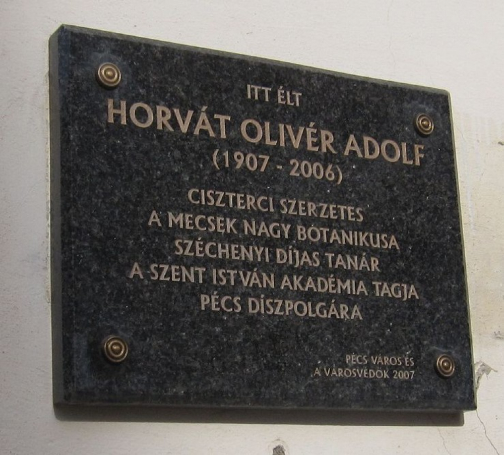 Dr. Horvát Adolf Olivér ciszterci szerzetes, Széchenyi-díjas botanikus, a Mecsek flórájának kutatója, gimnáziumi tanár emléktáblája, aki az utolsó lakók egyike volt a Pécsi Egyházmegyei Könyvtár nemrég átadott, feljított épületének, 2021. október 1-jén visszakerült az épület falára.