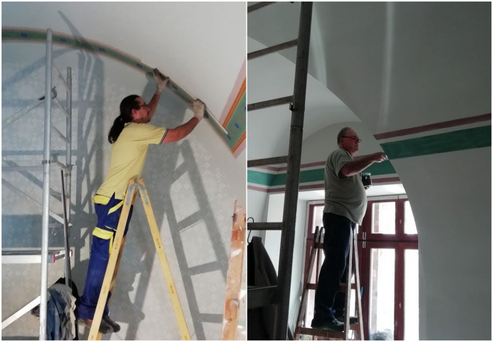 Csak a földszinti helyiség volt az, amely teljes egészében rekonstrukcióra alkalmas volt: ott az örökségvédelmi hatósággal egyeztetve a több rétegben található festések közül a 19. században készült két réteg közül a korábbit állították vissza, a tanúfelületek meghagyásával. [2] A rekonstrukciós festést Varga Péter felügyeletével Matosics Ferenc és Tar Árpád készítette el. [3]