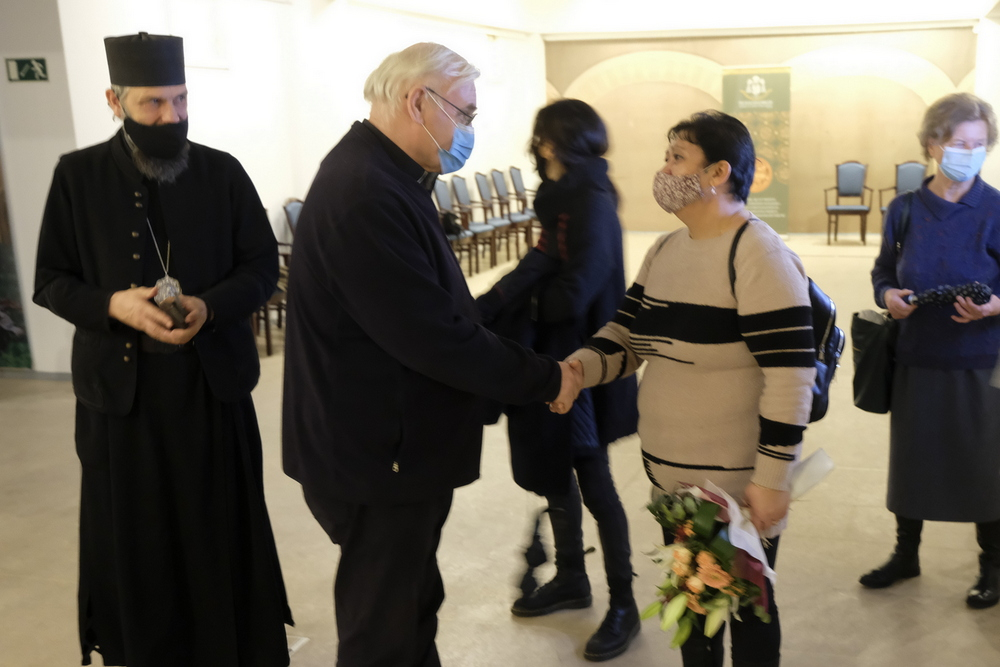 Kvanduk Frigyes, a Pécsi Egyházmegye általános helynöke gratulál Ráczné Kalányos Gyöngyinek, a festmények megalkotójának