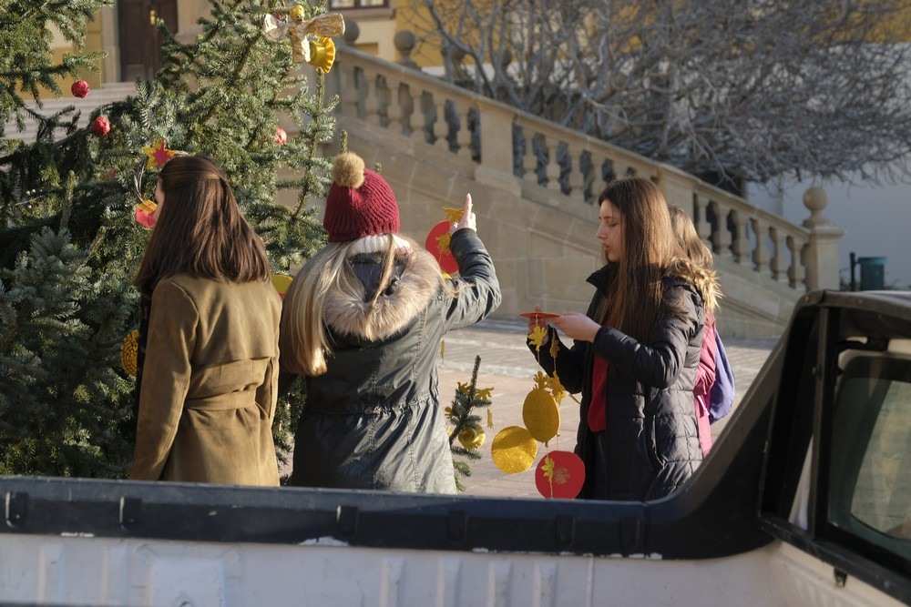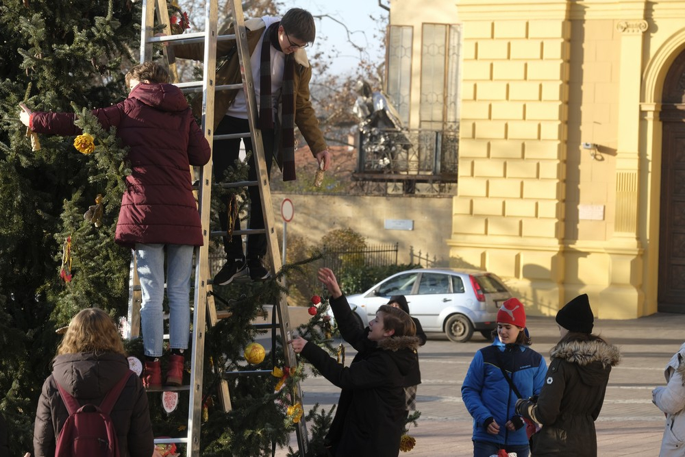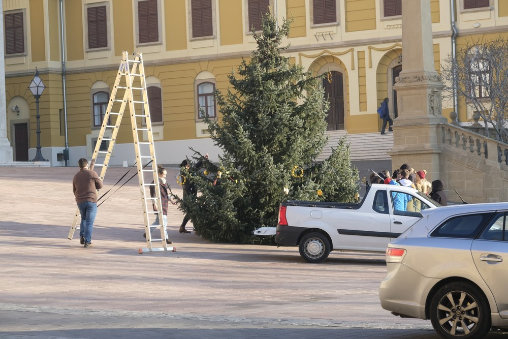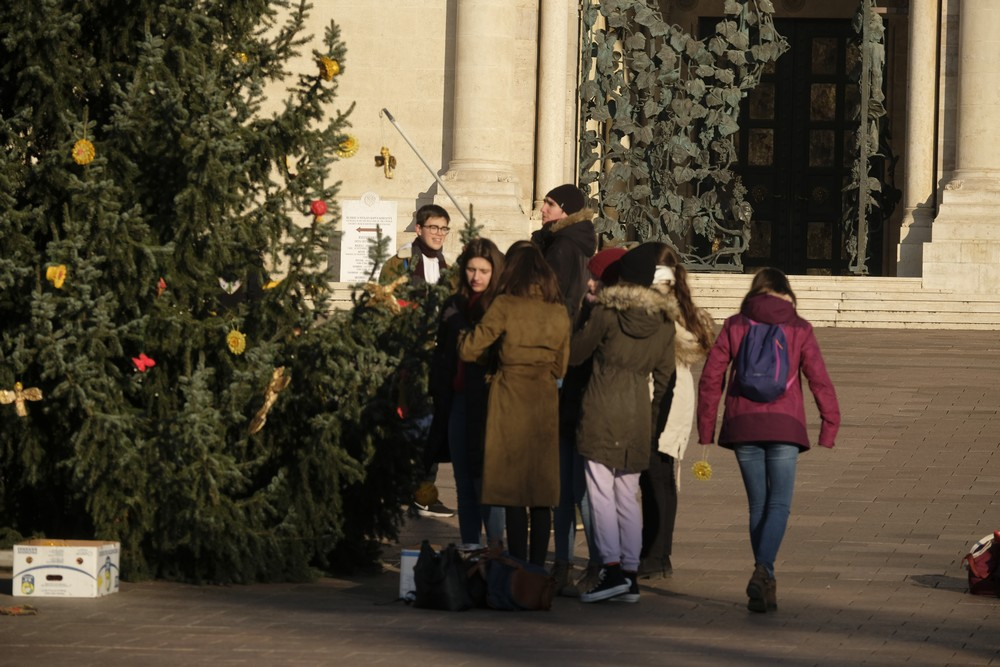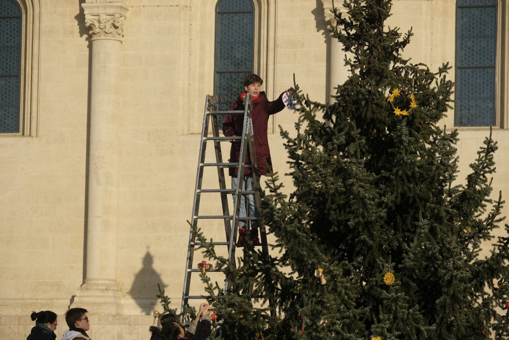 A téli szünidő első napjának reggelén lelkesen érkeztek szolgálatra a pécsi Szent Mór Iskolaközpont diákjai, hogy feldíszítsék a Pécsi Egyházmegye Dóm téren, valamint a Püspöki Hivatal előterében felállított karácsonyfáit. Az iskola tanulói és tanárai - a korábbi évek hagyományai szerint - idén is saját kezűleg készítettek karácsonyfadíszeket. A napsütéses időjárás kedvezett a munkálatoknak, melyben hivatali dolgozók is segédkeztek.