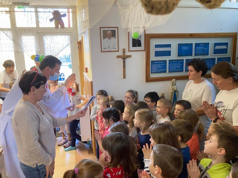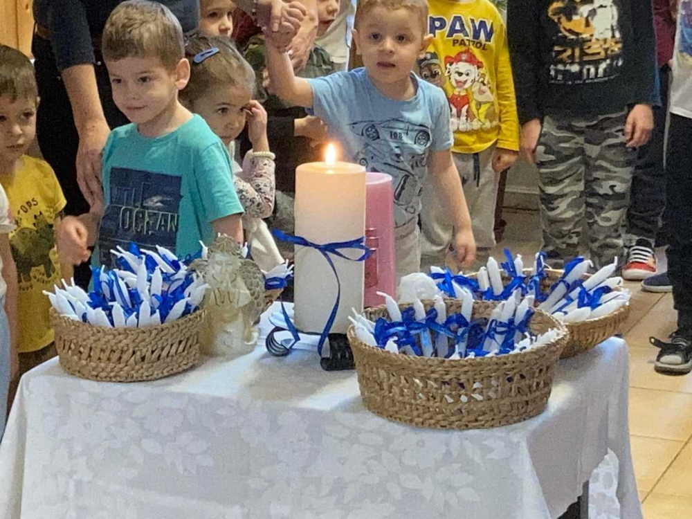 Zoltán atya elmesélte a balázsáldáshoz kapcsolódó történetet, majd az Y-alakban meghajtott gyertyával megáldotta gyermekeinket és a munkatársakat. Közösen énekeltünk és imádkoztunk. A megszentelt gyertyákat pedig a gyermekek és a felnőttek hazavihették otthonaikba.