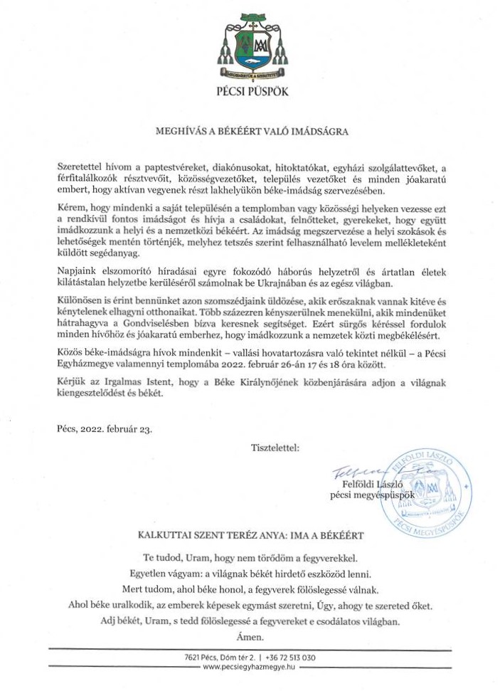 Közös béke-imádságra hívok mindenkit – vallási hovatartozásra való tekintet nélkül – a Pécsi Egyházmegye valamennyi templomába 2022. február 26-án 17 és 18 óra között.