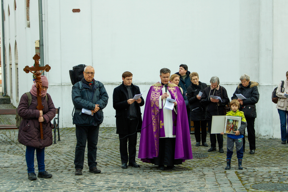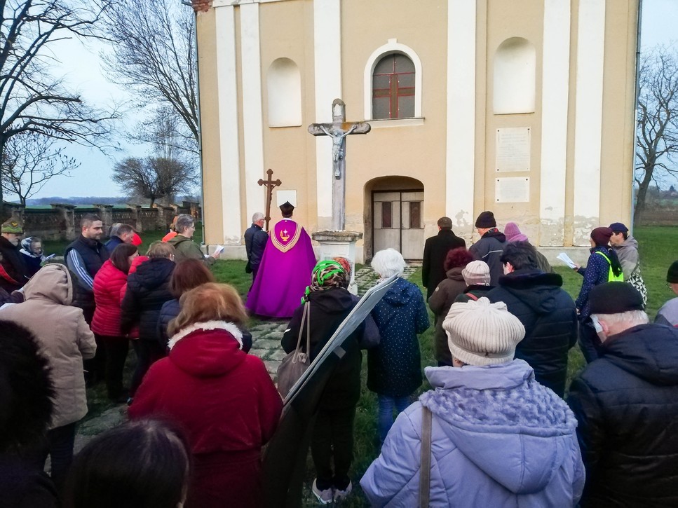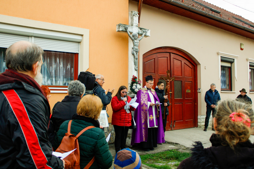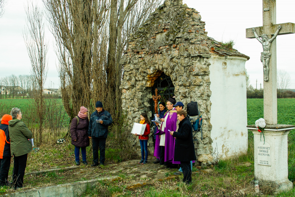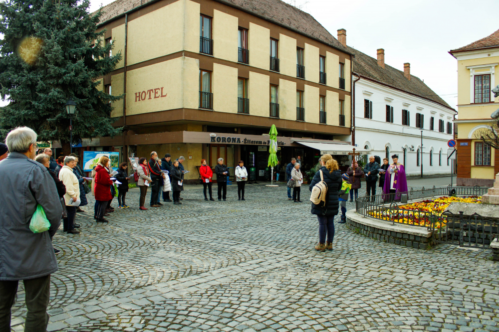 A napok óta tartó folyamatos esőzés csodálatosképpen elállt a keresztút kezdetére, és a mintegy ötven résztvevőt napsütés kísérte végig útjukon, melyen végig imádkoztak, énekeltek Dr. Rosner Zsolt plébános vezetésével.