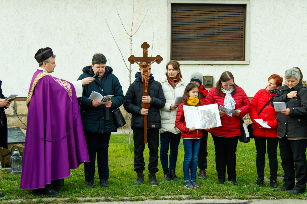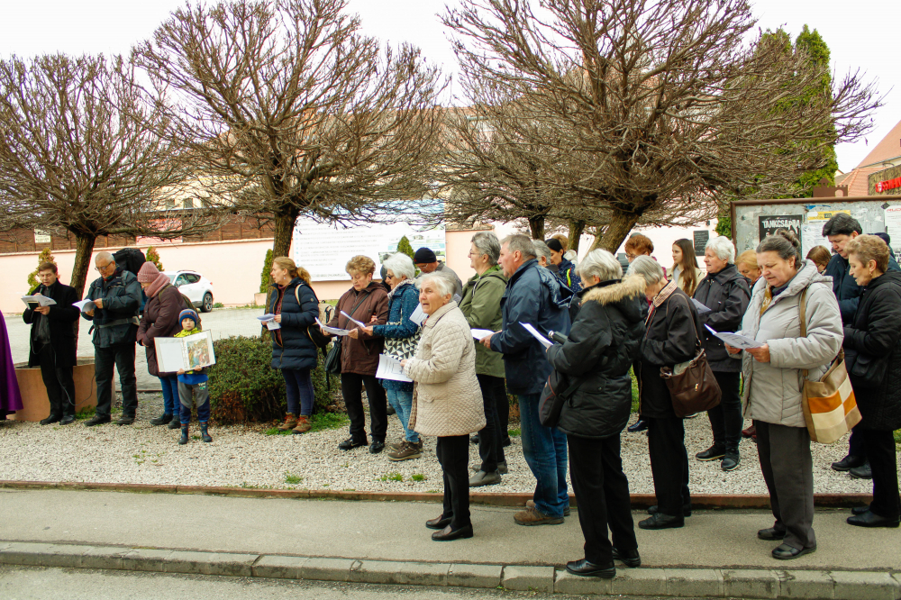 A turbéki Segítő Szűz Mária-kegytemplom felújításáért indított „TurbéKihívás 2022” jótékonysági programsorozat keretében megtartott városi keresztúton imádkoztak a hívek 2022. április 1-jén Szigetváron.
