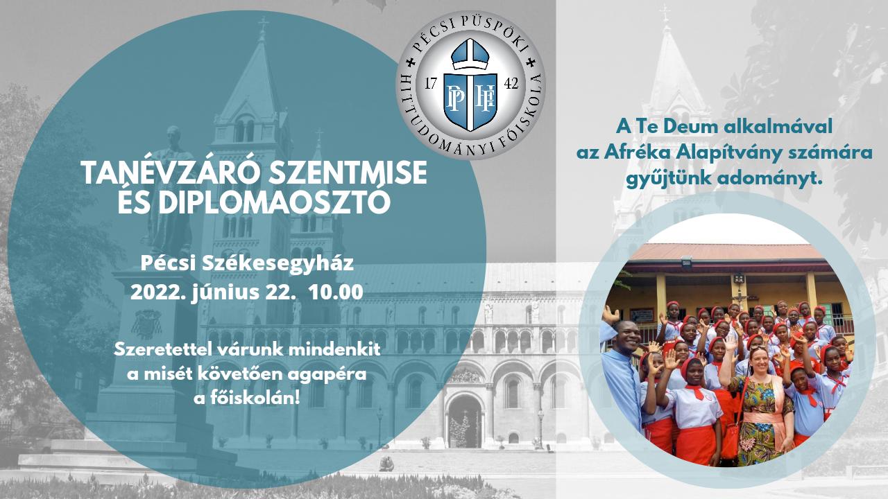 A Pécsi Püspöki Hittudományi Főiskola hálaadó szentmisére és diplomaosztóra hív minden hallgatót és érdeklődőt a pécsi Szent Péter- és Szent Pál-székesegyházba 2022. június 22-én, 10.00 órai kezdettel. A Te Deum szentmisét Felföldi László pécsi megyéspüspök celebrálja.