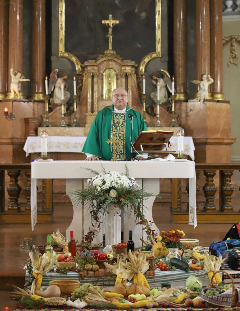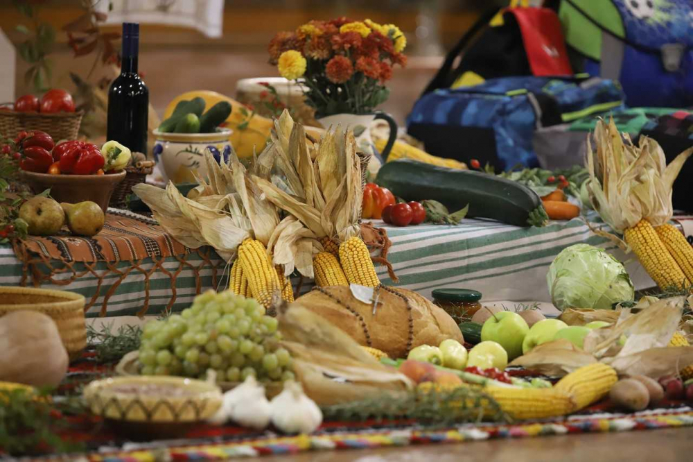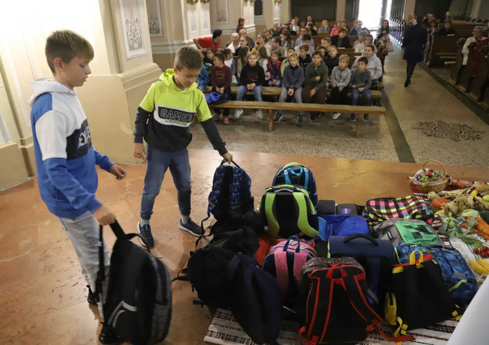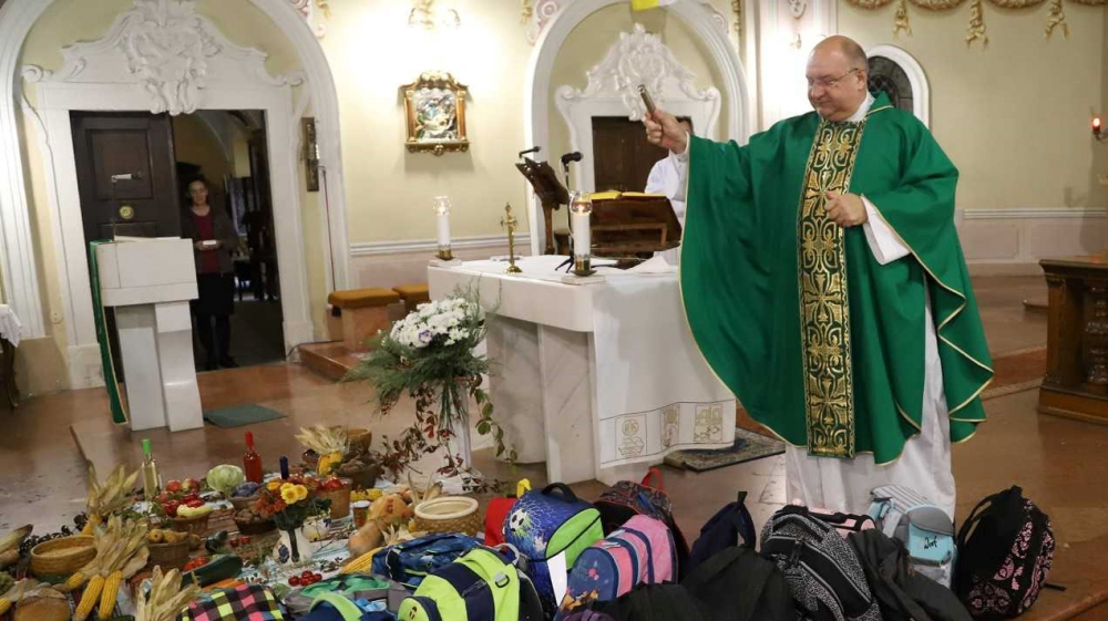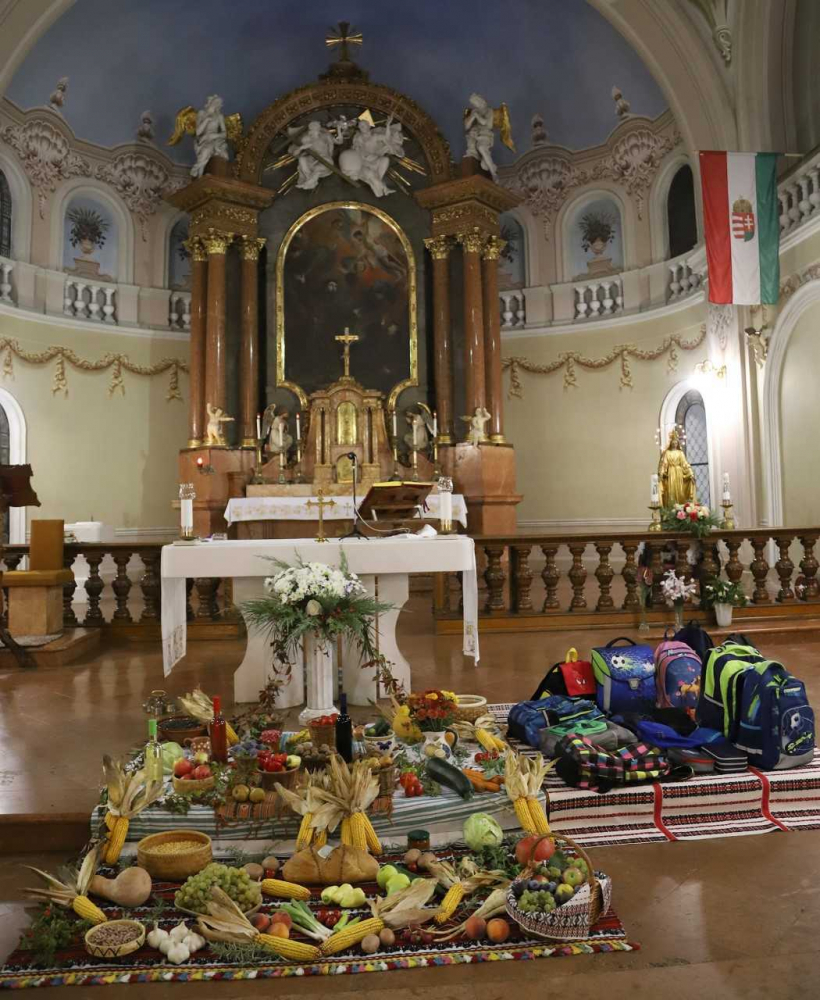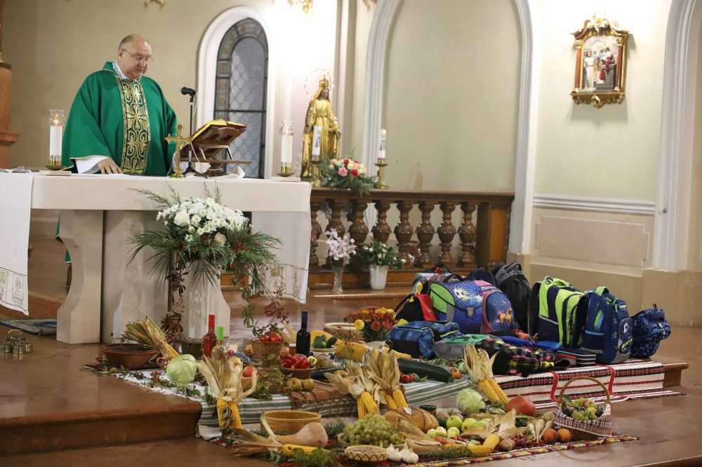 Az oltár előtt gazdagon terített „asztal” várta a misére érkezőket, az ősz bősége és színpompája emelte az ünneplés fényét, gazdagította a templom díszítését. Majd, ahogy sorban érkeztek a pécsi horvát iskolaközpont hittanosai, táskák kerültek a termények mellé. „Az iskolatáskátok a mindennapi munkátokat, tanulásotokat jelképezi. Amikor a táskáitokat megáldjuk, azzal a mennyei Atya segítségét kérjük a mindennapi munkátokhoz, tanulásotokhoz” - mondta a szertartás elején Bacsmai László.