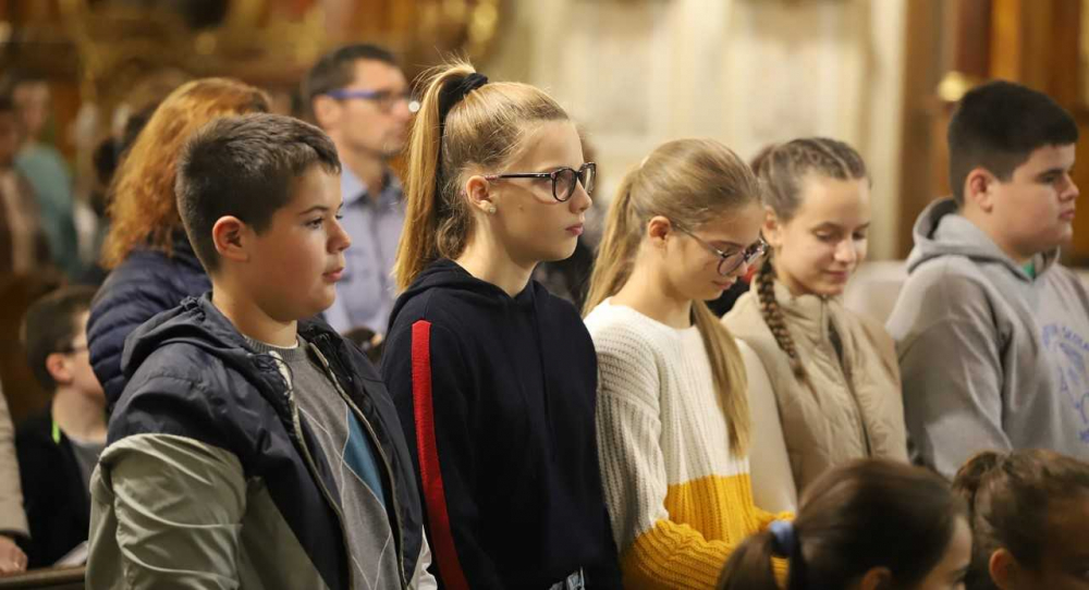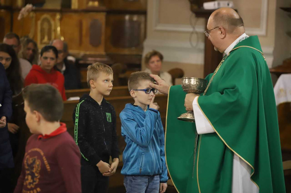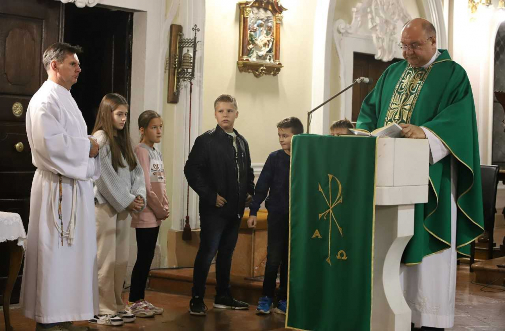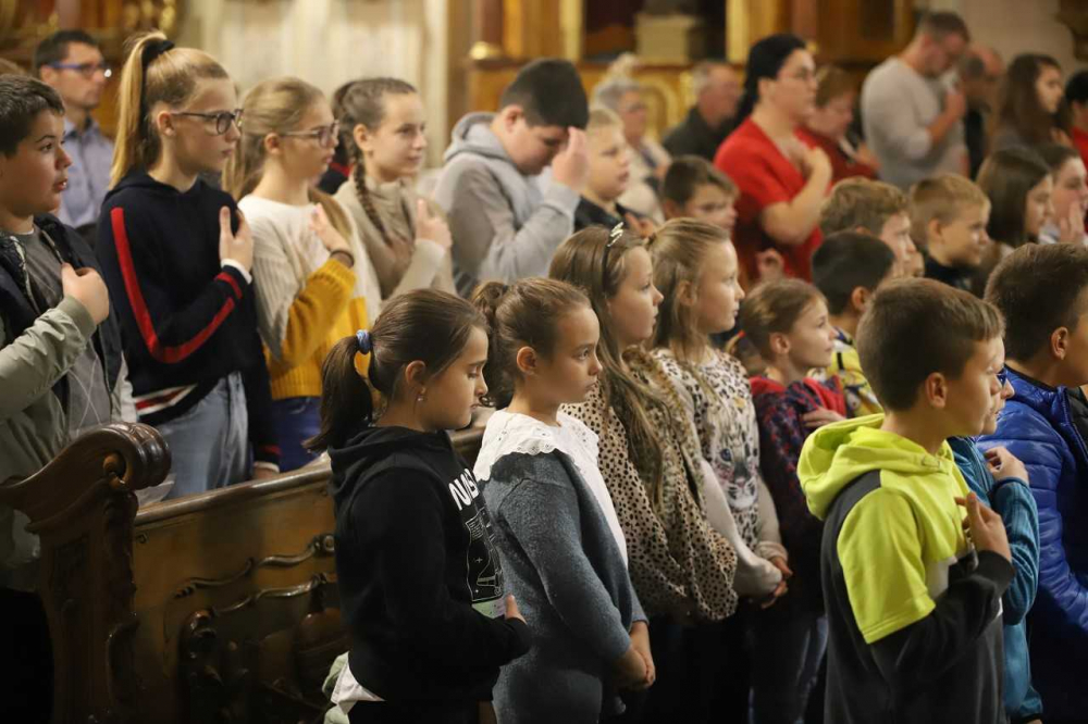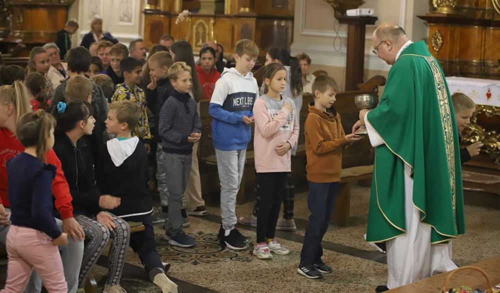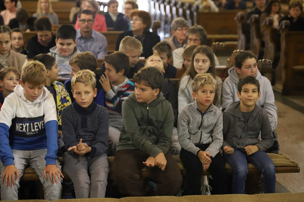 Az oltár előtt gazdagon terített „asztal” várta a misére érkezőket, az ősz bősége és színpompája emelte az ünneplés fényét, gazdagította a templom díszítését. Majd, ahogy sorban érkeztek a pécsi horvát iskolaközpont hittanosai, táskák kerültek a termények mellé. „Az iskolatáskátok a mindennapi munkátokat, tanulásotokat jelképezi. Amikor a táskáitokat megáldjuk, azzal a mennyei Atya segítségét kérjük a mindennapi munkátokhoz, tanulásotokhoz” - mondta a szertartás elején Bacsmai László.