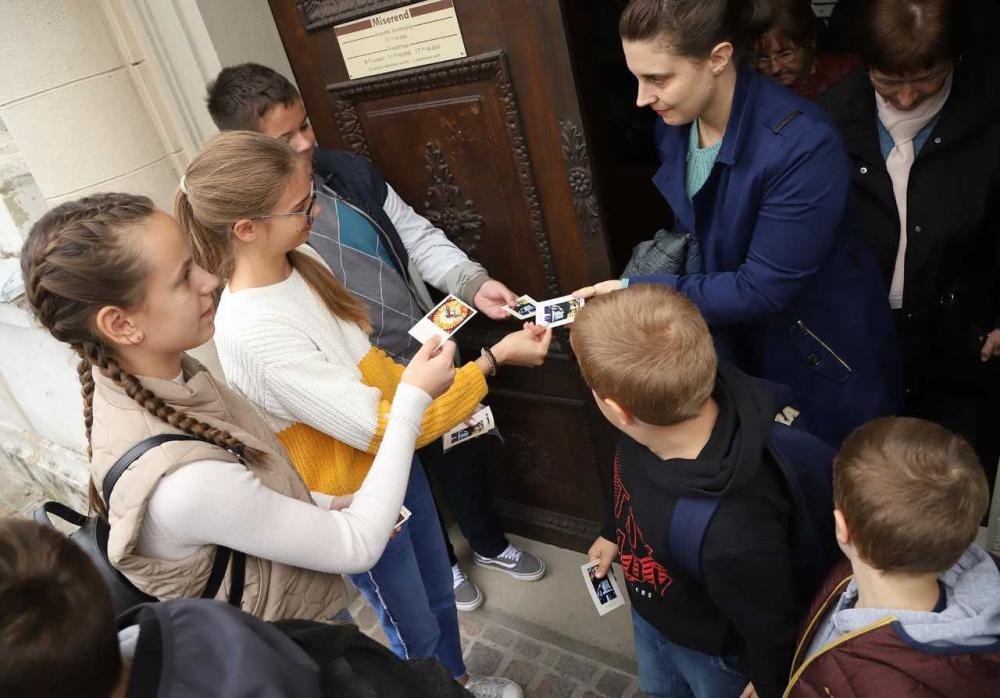 A templom ajtajánál a Szentlélekhez szóló imakártyákat osztottak a hittanosok, Kollár Ákos felajánlásából.