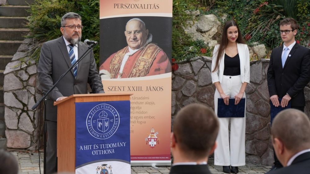 A minisztérium a felsőoktatás fejlesztésével az egész nemzet felemelkedését hivatott szolgálni, melynek záloga az erős, cselekvőképes embereket képző felsőoktatás, melynek sorába a XXIII. János Pápa Szakkolégium is csatlakozhat. „Örömmel avatjuk fel a II. vatikáni zsinat megnyitásának 60. évfordulóján ezt a kollégiumot Pécsett, a magyar felsőoktatás bölcsőjében" - erősítette meg a főtanácsos. A minisztérium a felsőoktatás megújításában a történelmi egyházaknak is meghatározó szerepet szán, hiszen az egyházak mintaértékű fenntartói az oktatási intézményeknek évszázadok óta, ahol minőségi tudást adnak át a hallgatóknak. A magyar oktatás történetének szerves része Pázmány Péter és Szenci Molnár Albert mellett Klimó György pécsi püspök is. A magyar kormány elkötelezte magát, hogy a világi egyetemeket érintő felsőoktatási modell reformja után az egyházi felsőoktatási intézmények fejlesztését is hosszú távon biztosítsa. Amíg van tudásra éhes fiatal, addig van magyar jövő is - zárta beszédét Hegyi László.