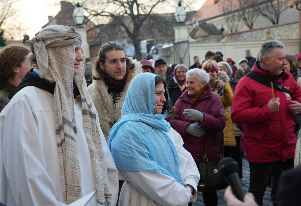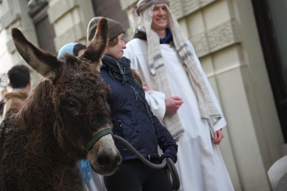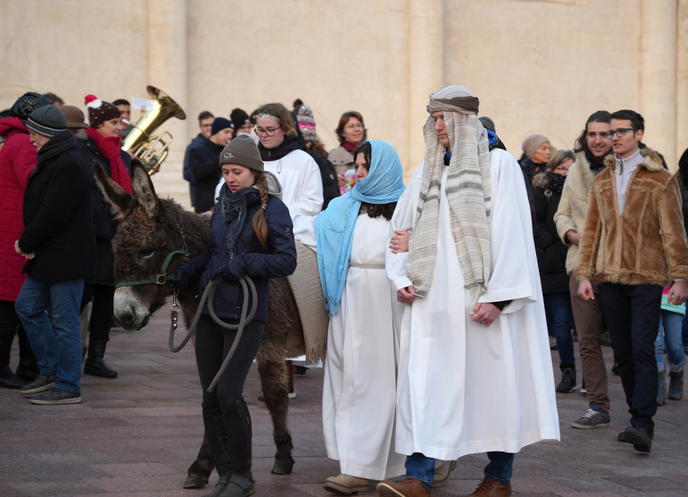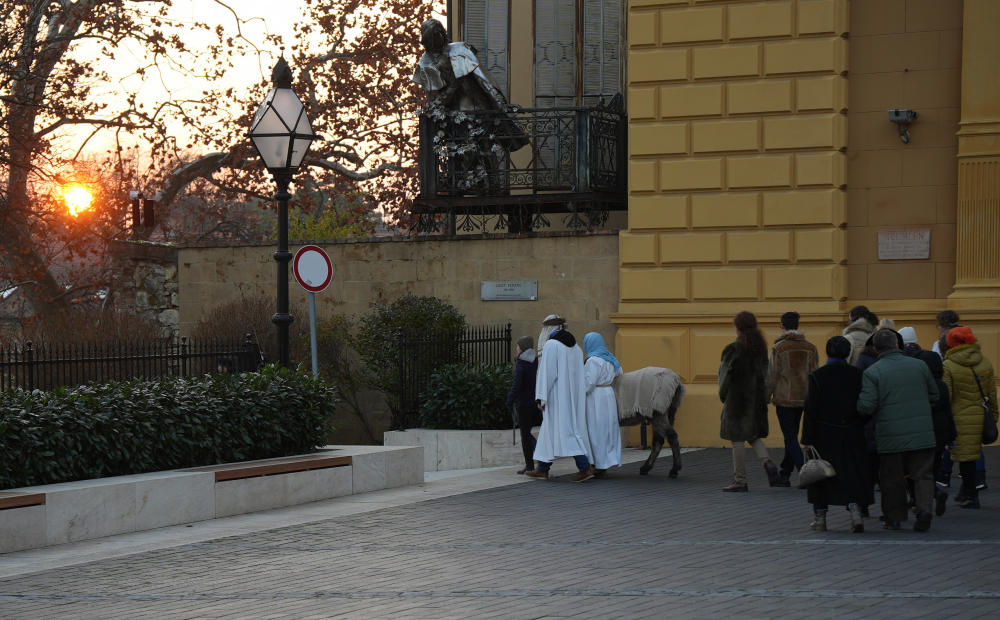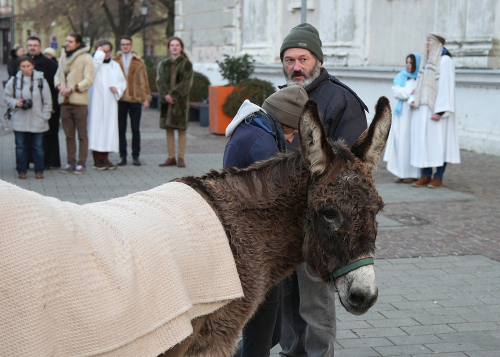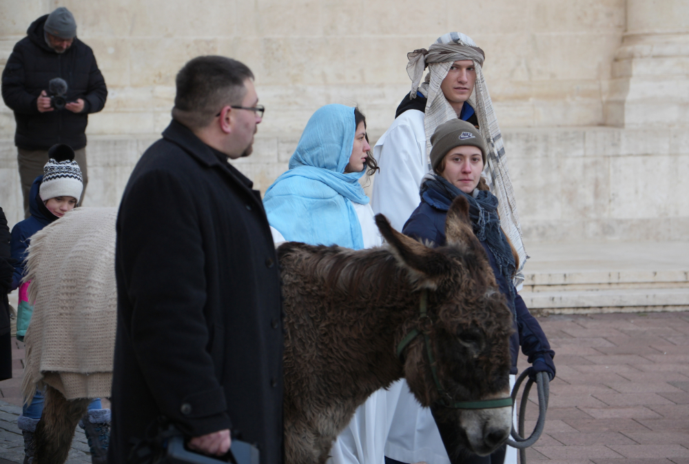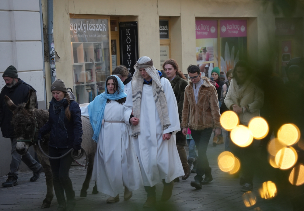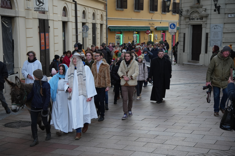 Az angyali üdvözletet, József álmát és a kisded Jézus születését jelenítették meg jelmezbe öltözött fiatalok, akik énekszóval, zenei kísérettel szamárháton indultak útra, hogy szállást keressenek a Szent Család számára december 18-án Pécs belvárosában. A menethez több százan csatlakoztak, köztük gyermekek, fiatalok és idősebbek, akik idén karácsonykor is szállást adnak szívükben a kisded Jézus, Mária és József számára.