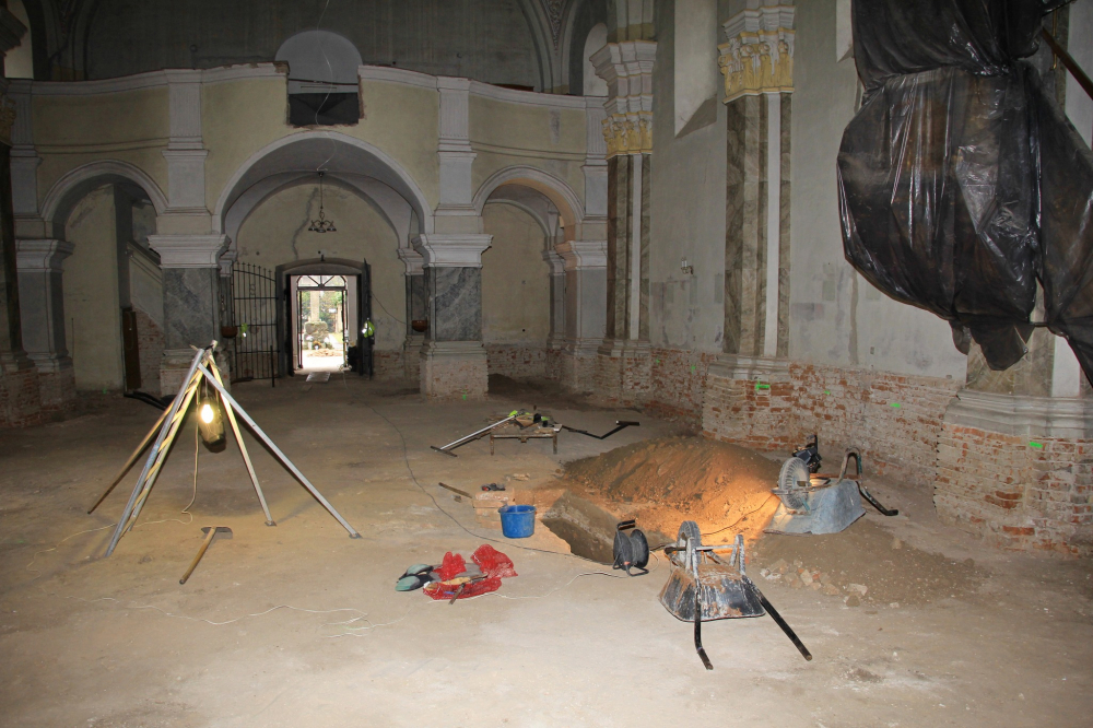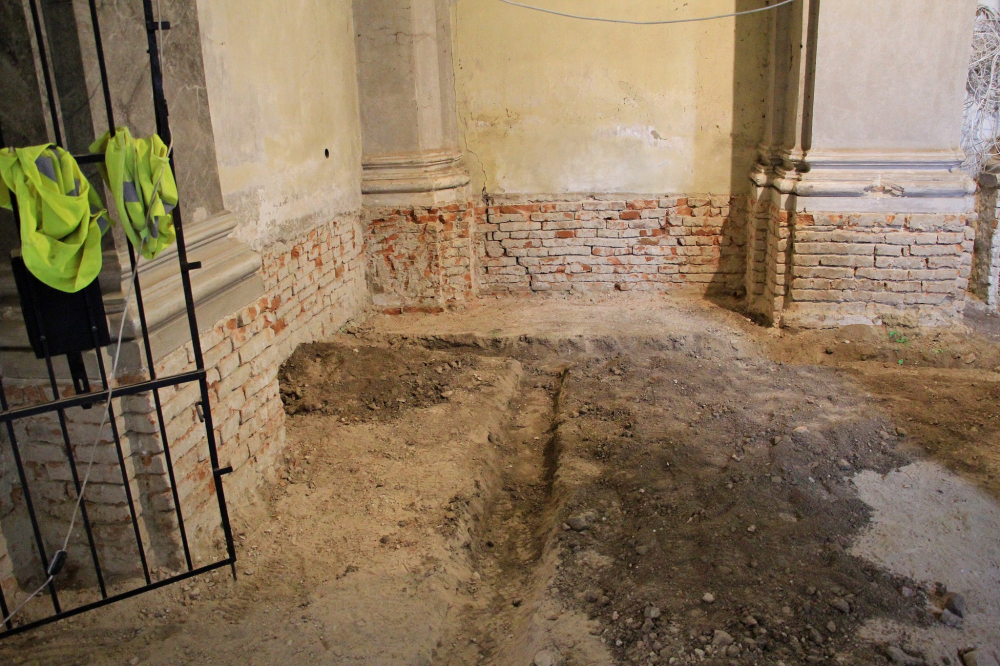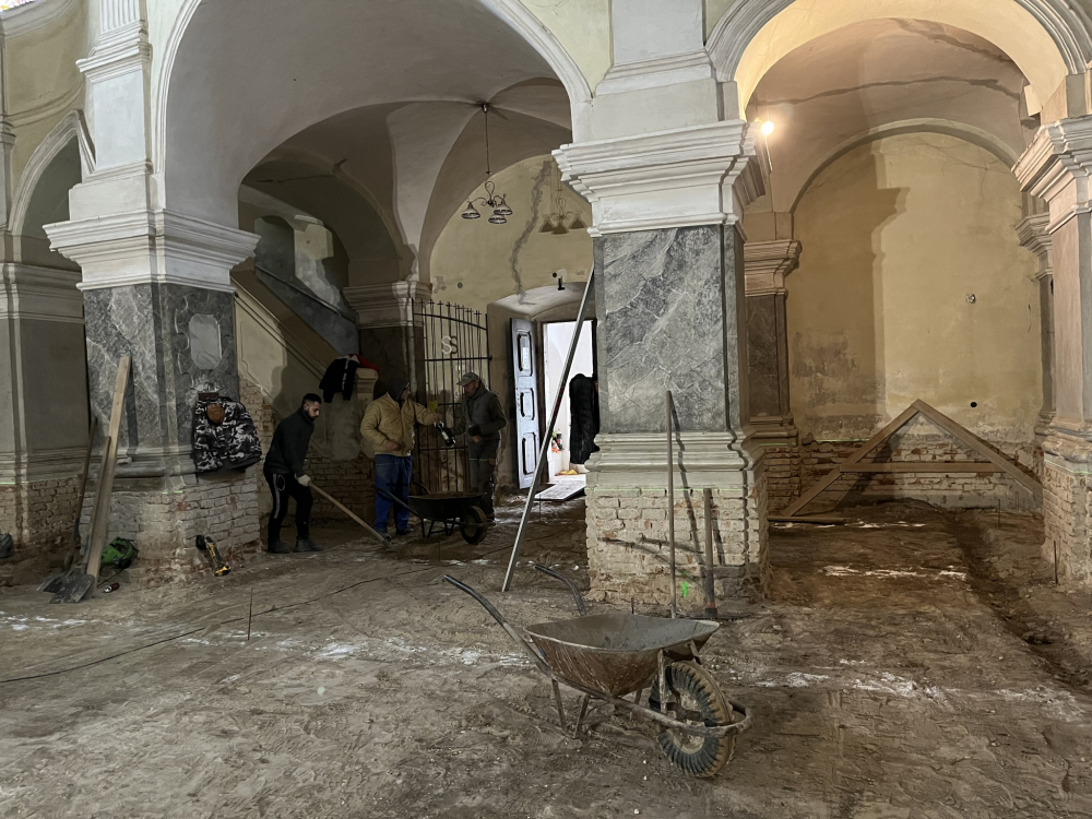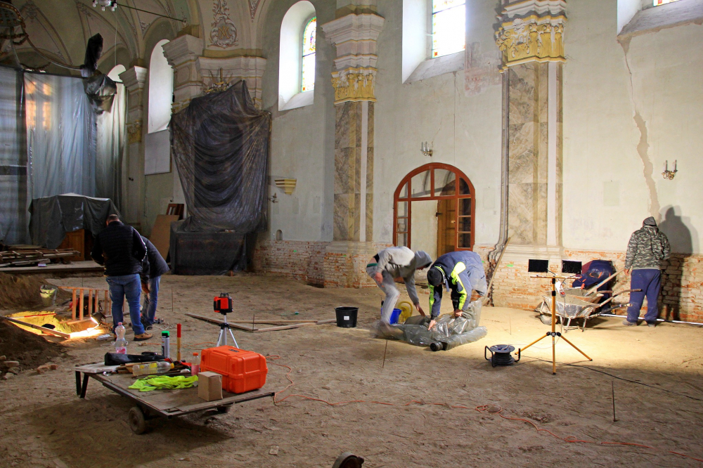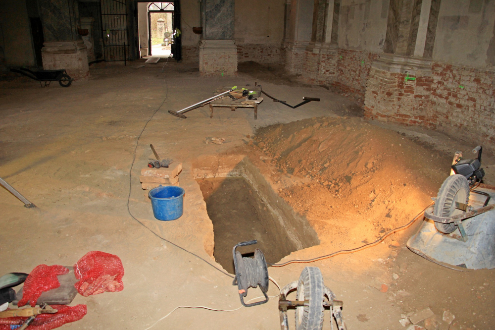 Felszedték és elbontották az épület teljes padlóburkolatát és aljzatát, ezzel párhuzamosan megkezdődött a leendő új padozat síkjának kialakítása, szintezése, a süllyedések kiegyenlítése. A külső körítő főfalak mentén betonozott kábelcsatornát és páradiffúziós árkot alakítottak ki. A belső lábazat cementvakolatát eltávolították, ahol villanyszerelési munkák falkábeleit helyezték el az engedélyezett örökségvédelmi terv szerint.