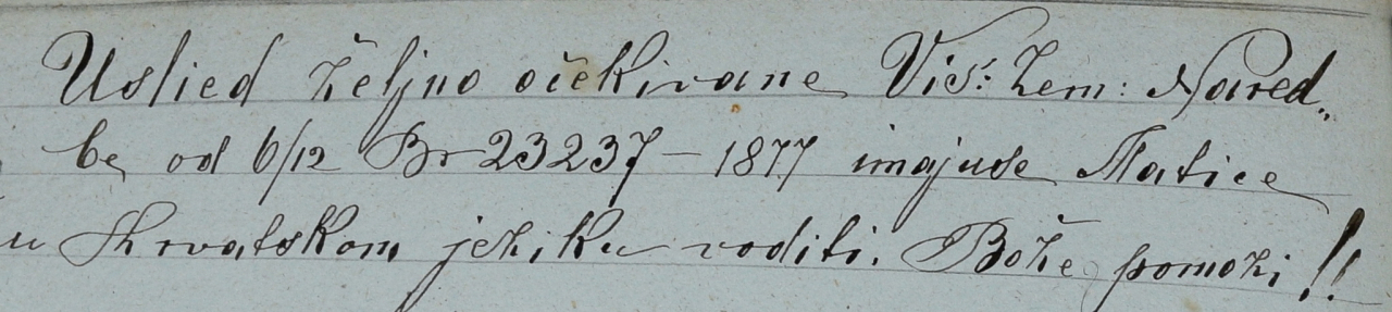 „Usli[j]ed željno očekivane Vis[oke] Zem[aljske] naredbe od 6/12 br[oj] 23237 – 1877 imajuse matice u hrvatskom jeziku voditi. Bože pomozi!!”