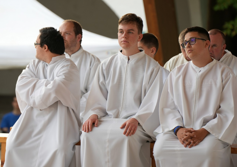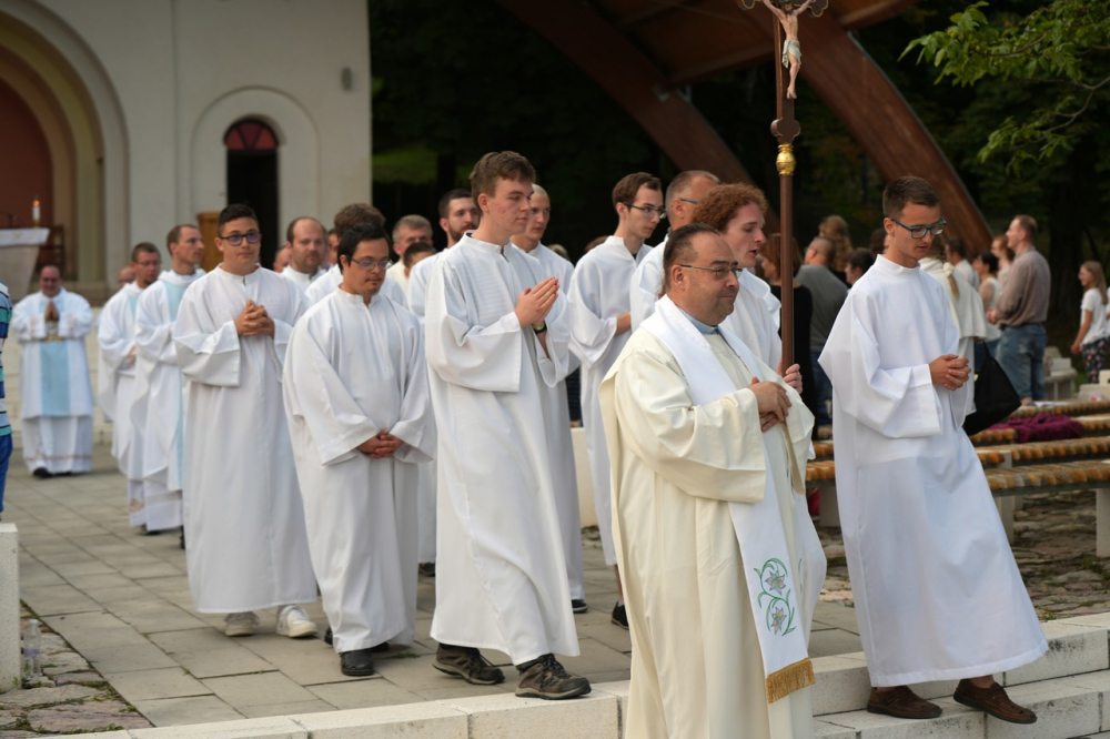 A szentmisét követően közös csoportkép készült Felföldi László megyéspüspökkel, a papsággal és a fiatalokkal a kegyhely szabadtéri oltárához felvezető lépcsőkön.