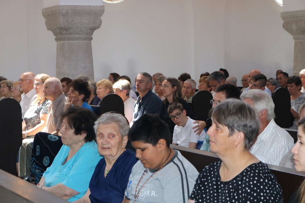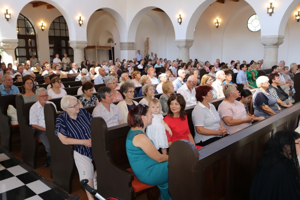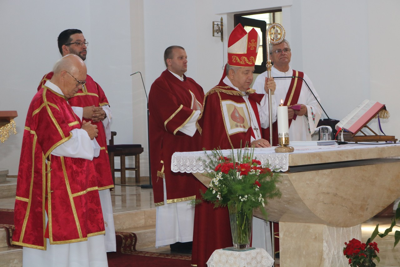 Most is itt vagyunk és ünneplünk a Szent Vér hónapjában. A katolikus egyház júniust Jézus Szent Szívének, a júliust Jézus Szent Vére tiszteletének szenteli, s erről emlékezünk meg. Azt is el lehet mondani, hogy ez a templom most 85 éves, 1938-ban az Eucharisztikus Kongresszus évében épült föl. Személy szerint nekem azért is kedves ez külsőre is, mert egyik kápláni helyemnek a temploma kísértetiesen hasonlított erre a templomra. Nem csoda, hiszen ugyanaz volt a tervezője, Lechner Loránd. A pestújhelyi templom az, ha valaki arra vetődik a XV. kerületben, akkor azt hiszi, hogy Bátán van, csak talán a tornyuk különbözik.